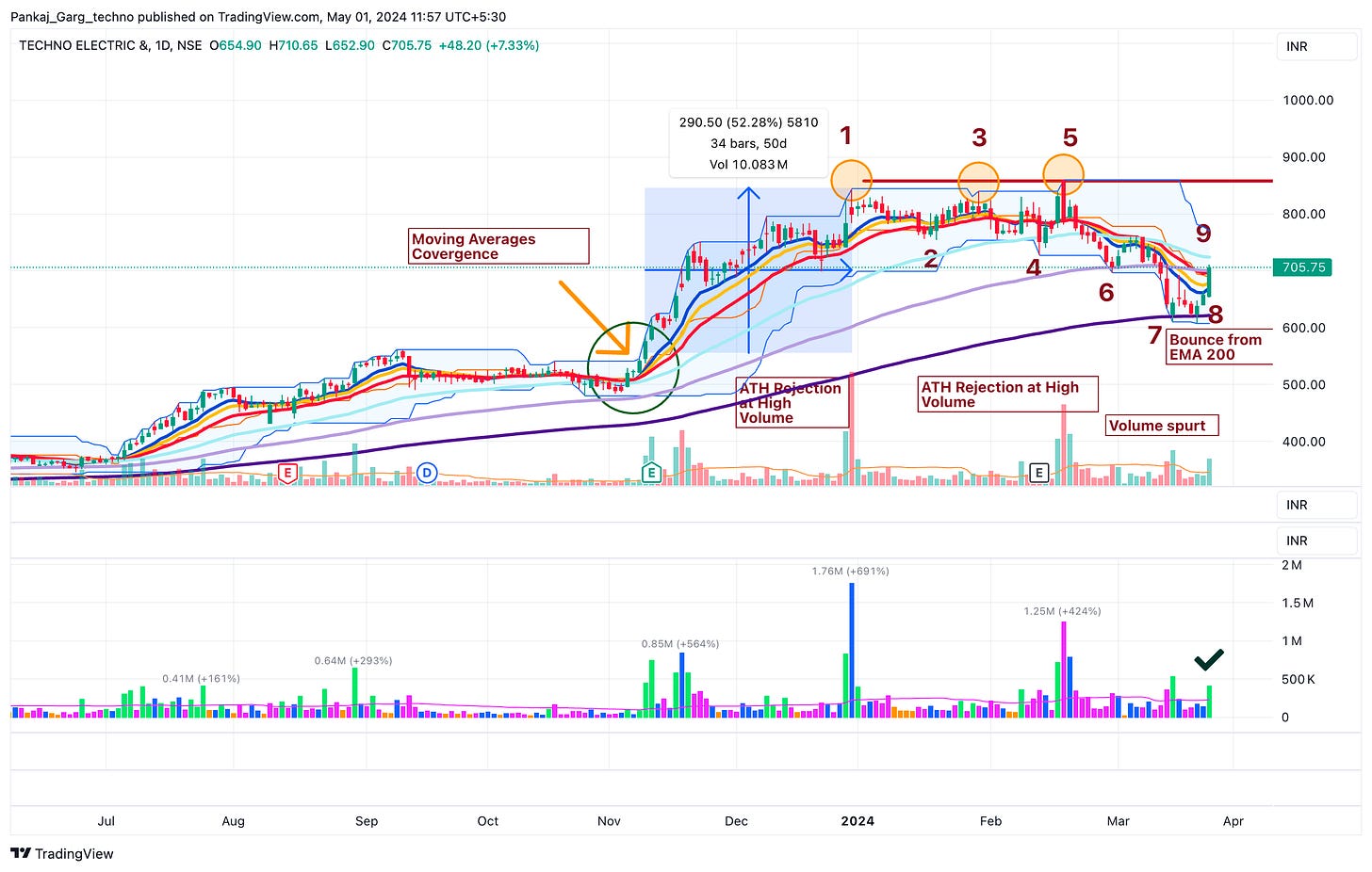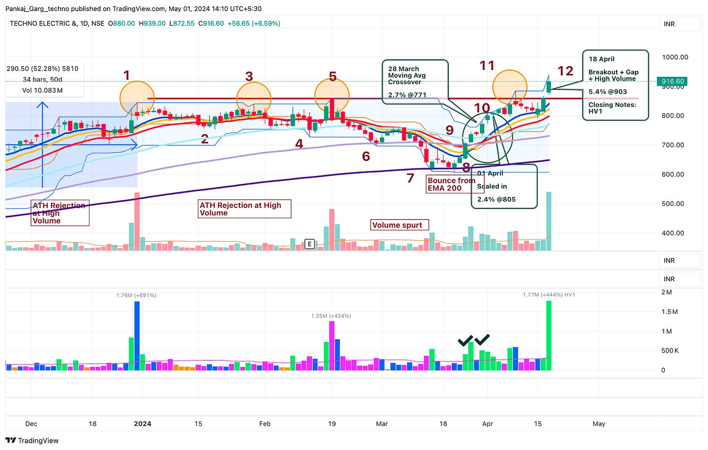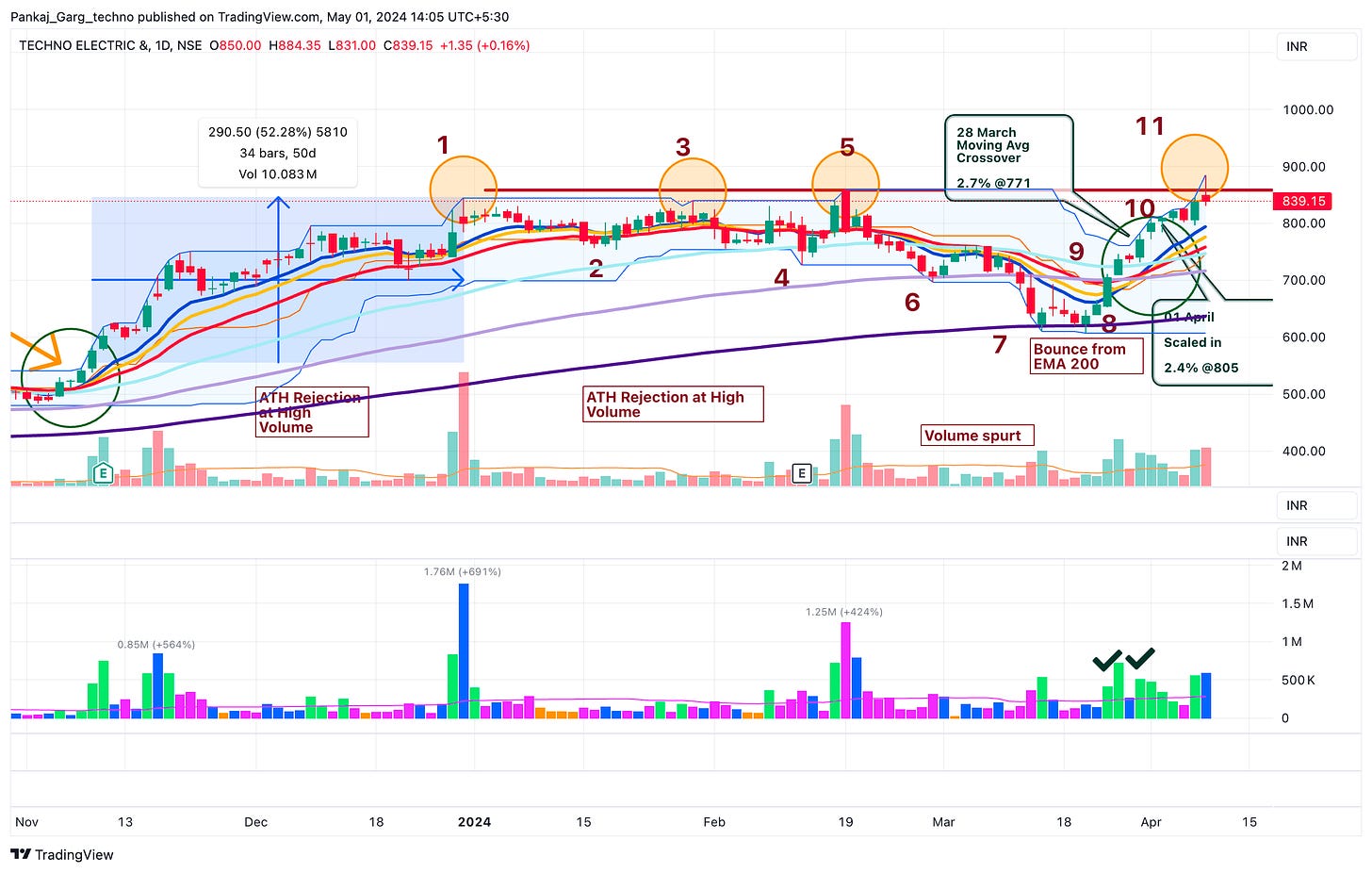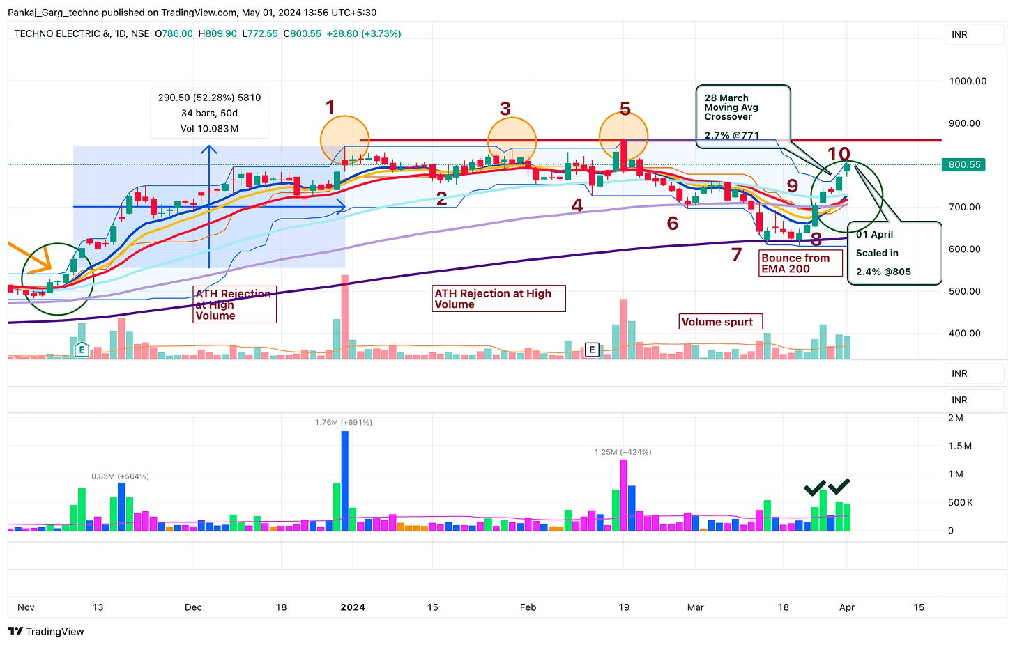 (10) 26-28 March 2024: The stock not only moved past EMA 50. It gave a pullback to EMA 50 on avg volume and bounced on above avg volume.