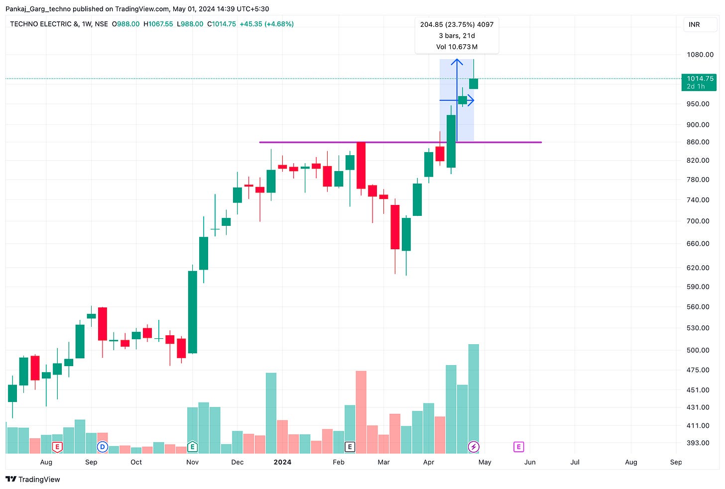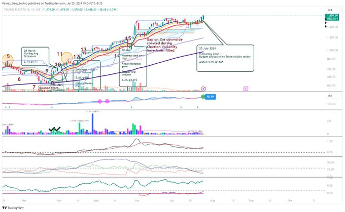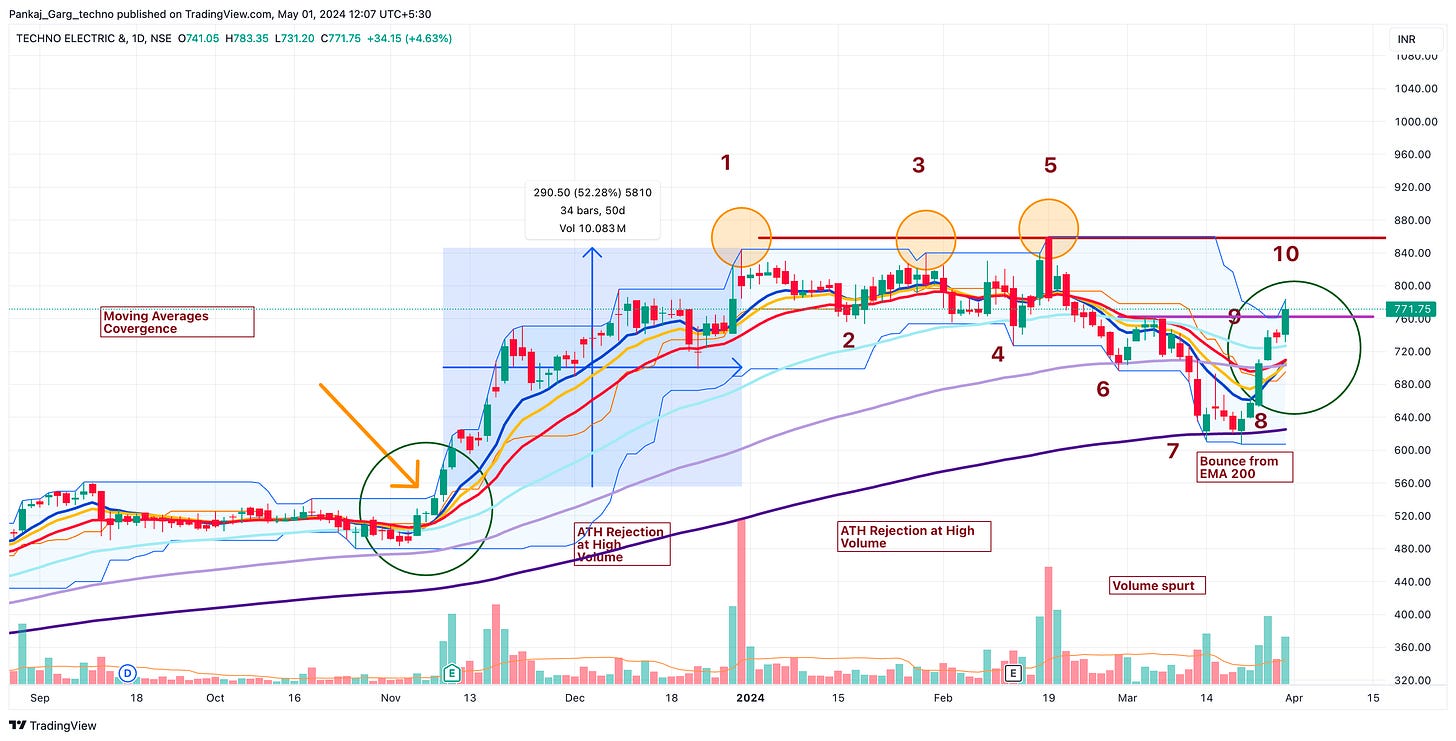 Techno Electric had in the past given a sharp up move when it broke into new highs after bouncing from the Moving Averages convergence. The Stock broke out on 9th November 2023 and gave a 50% move in 50 days.