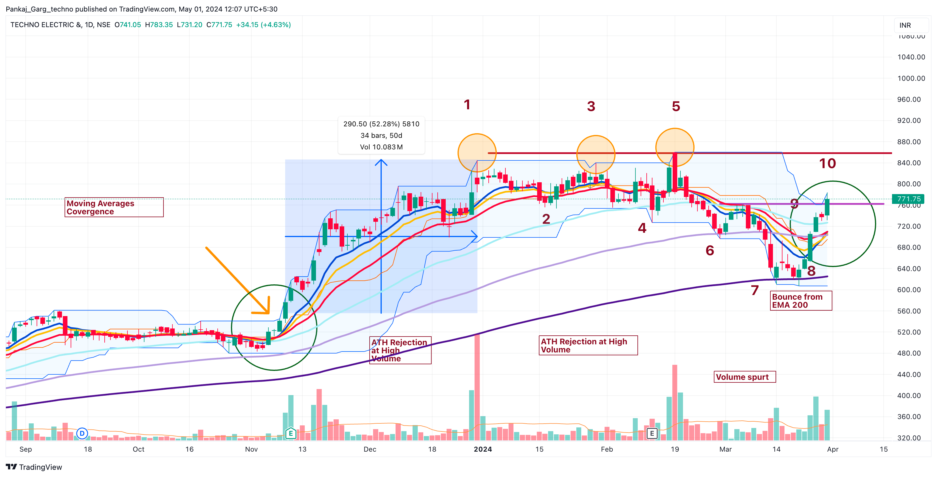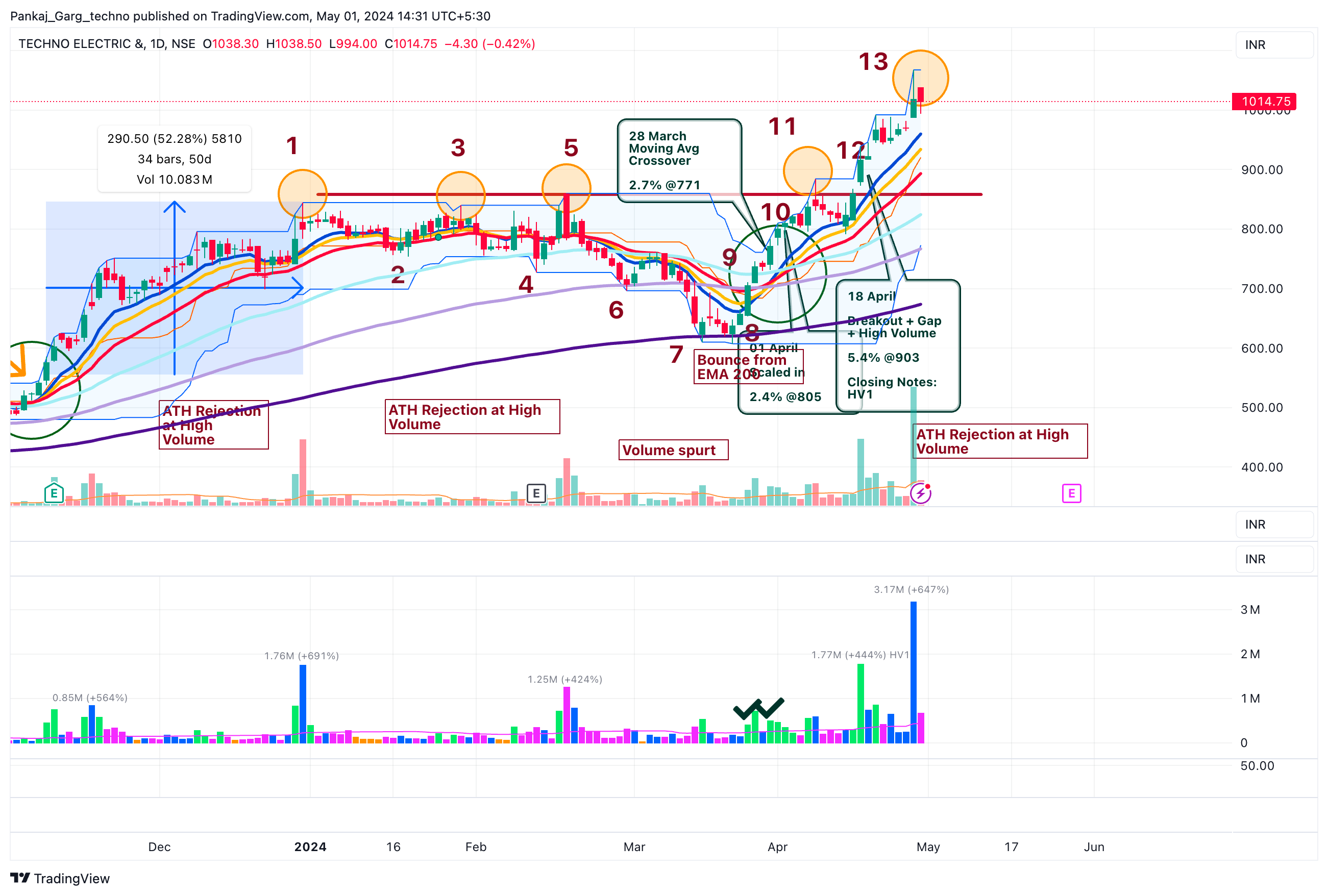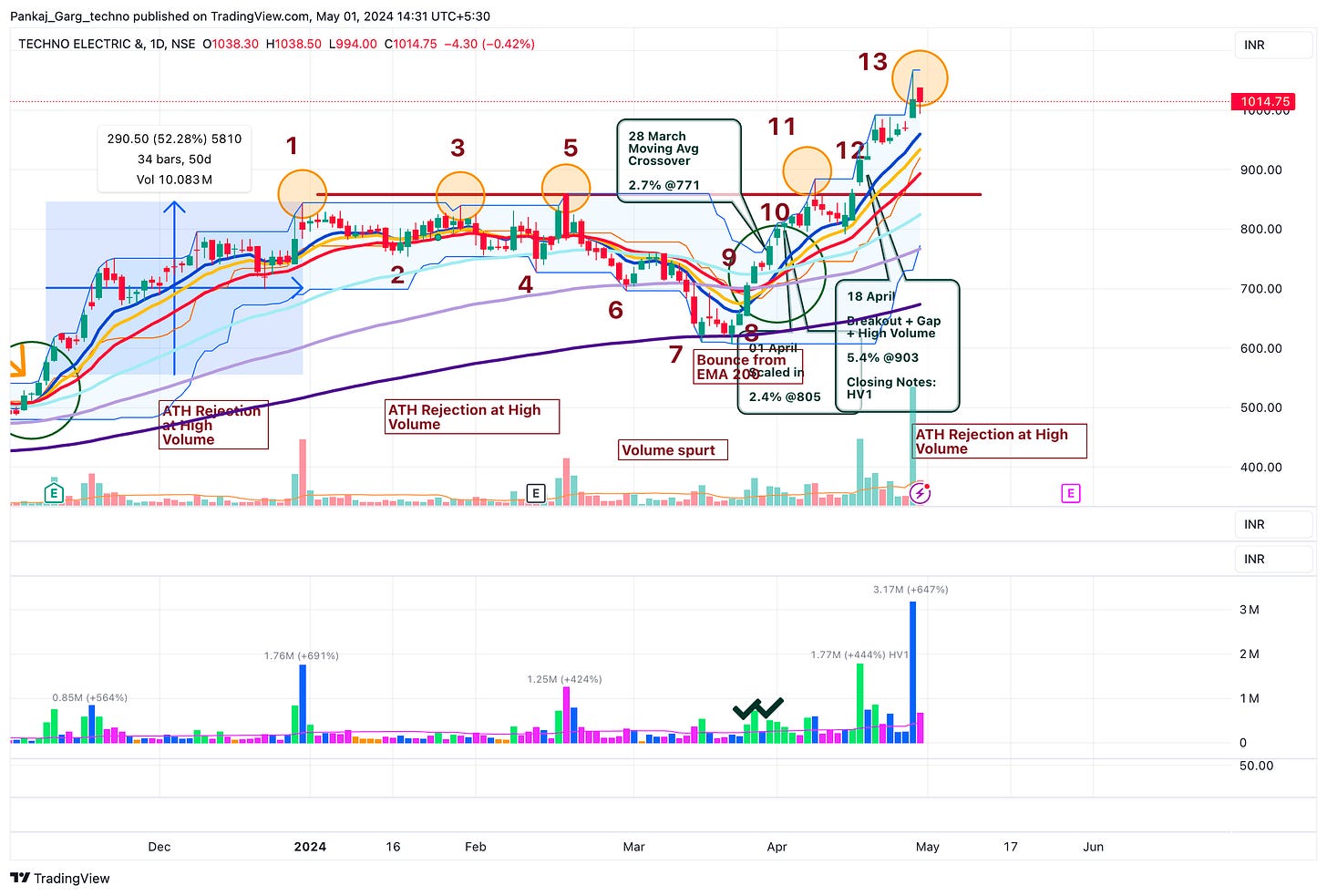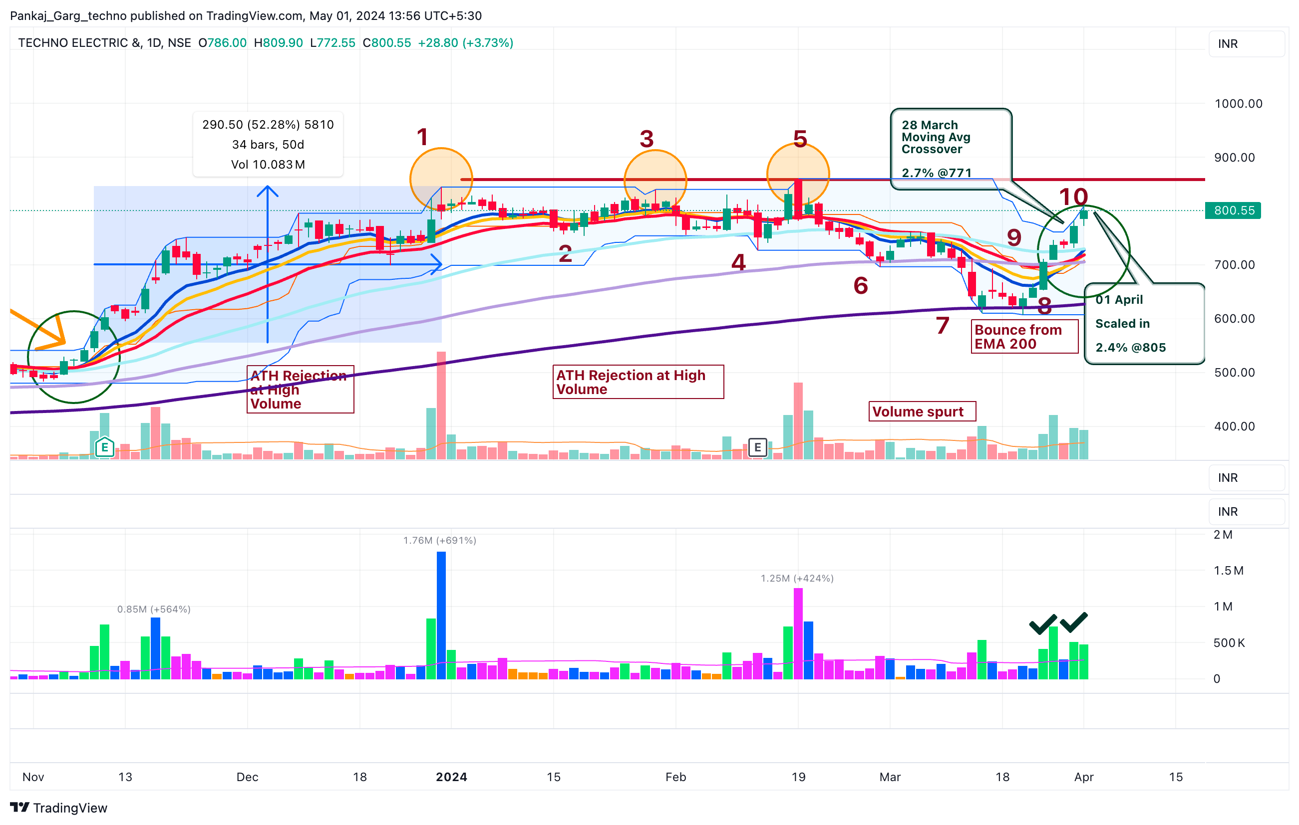 After the ATH attempt TECHNOE took support at EMA 13. A sharp bounce from EMA 13 on 16th April.
