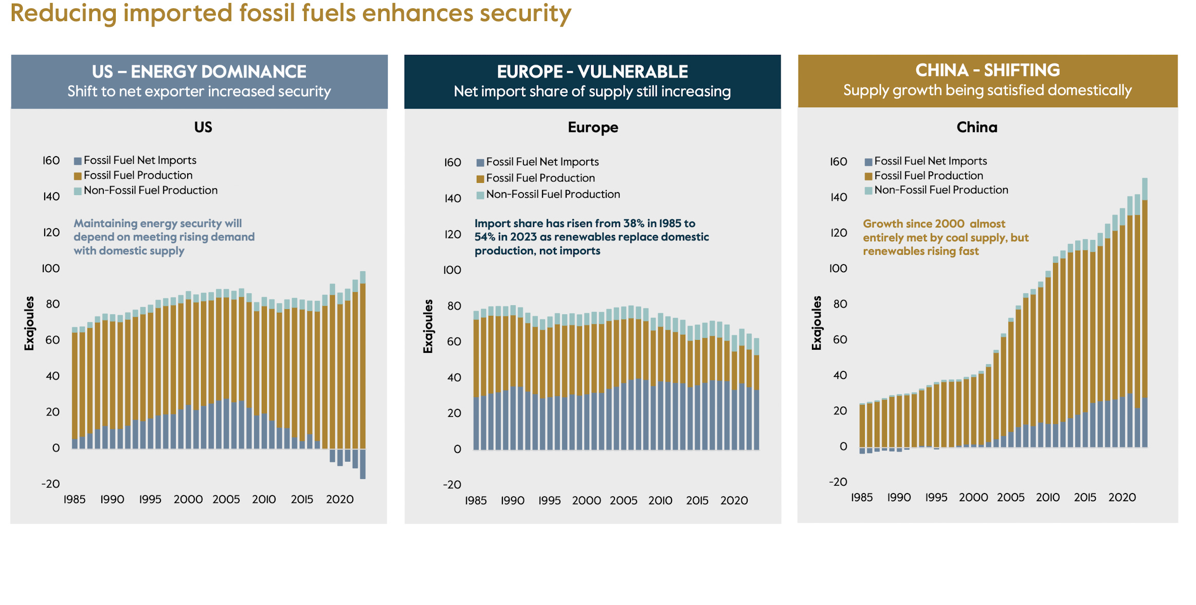 The key driving factor for energy transition is securing energy, leading to growth in renewable and nuclear, but at the same time, continued reliance on fossils, depending on the resource availability/securing resources in various geographies.