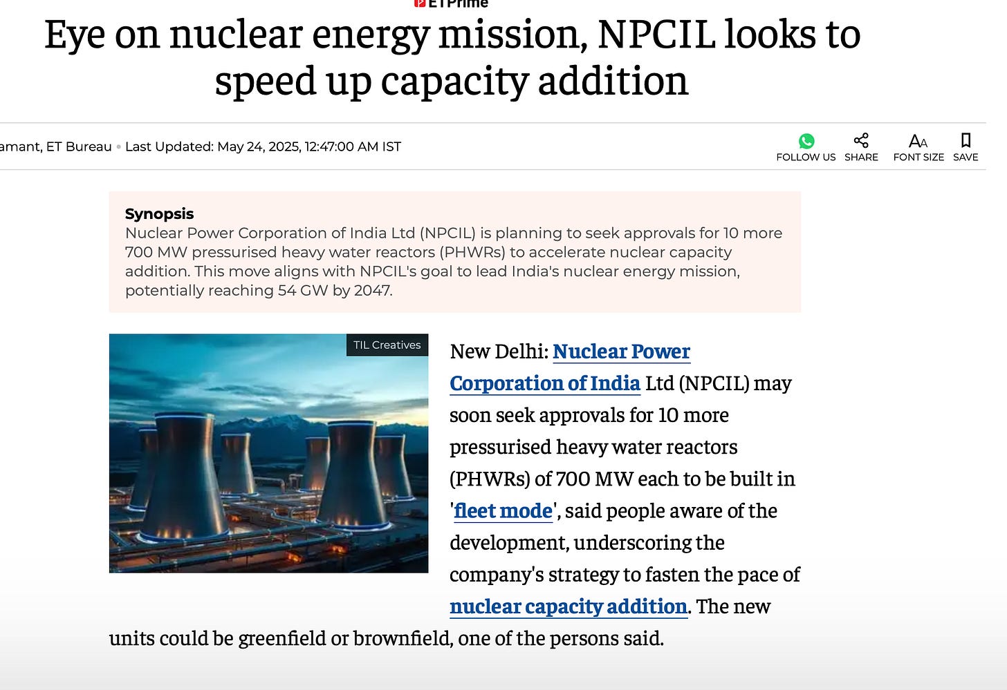 This objective would drive investments in renewable energy and nuclear for India as well. It is evident by the ongoing investments, e.g. India at #2 in the world in terms of nuclear capacity under constructionand it is set to accelerate