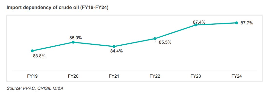 India is highly dependent on imported crude oil. India hedged its bets by having its own refining capacity and hence going downstream in the value chain.