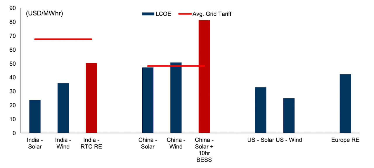 Despite not having an integrated manufacturing base, India’s renewable cost is over 25% lower than China's: