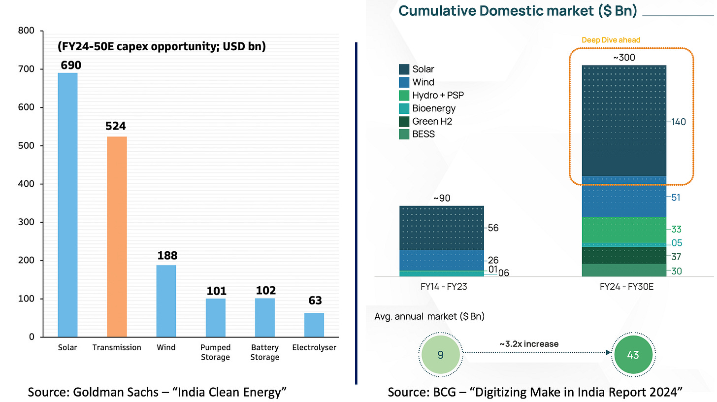 With this as an enabling factor different estimates point towards huge investments in the sector eg. Goldman Sachs report projects investment of US$ 1.7 Trillion towards energy transition capex in the next 25 years (including transmission). In the near term, the BCG report estimates investments to the tune of US$40 billion every year till FY2030 (excluding transmission).