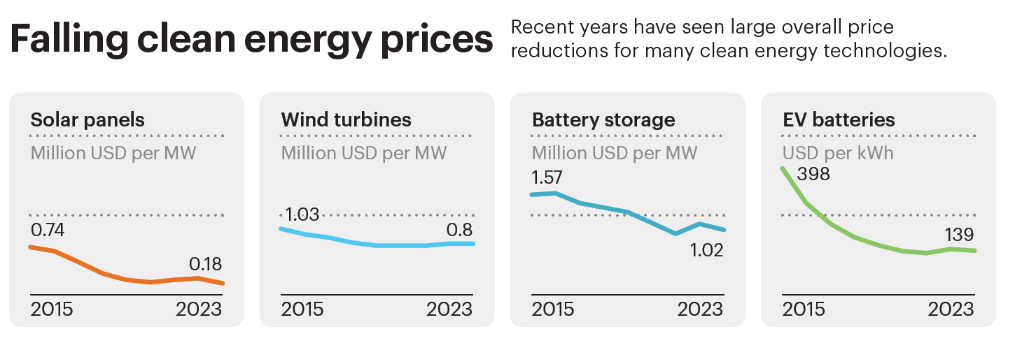 Clean energy technologies, including solar PV and wind power, have recently experienced substantial cost reductions, making them increasingly competitive with fossil fuels.