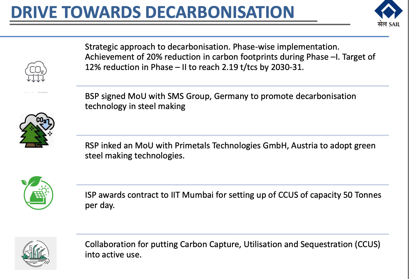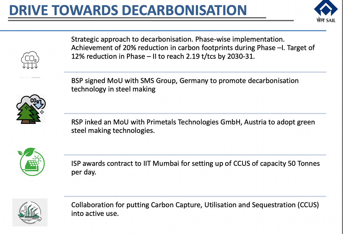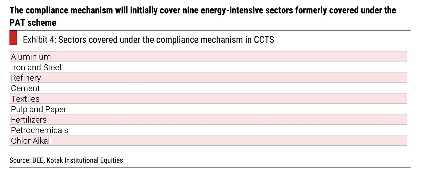 This will also have a spillover effect to decarbonize industries like steel which is likely to focus more on Green Hydrogen or EAF. Companies are already investing towards this effort - part of the reason being uncertainity of evolving regulations in export markets especially in the developed world.