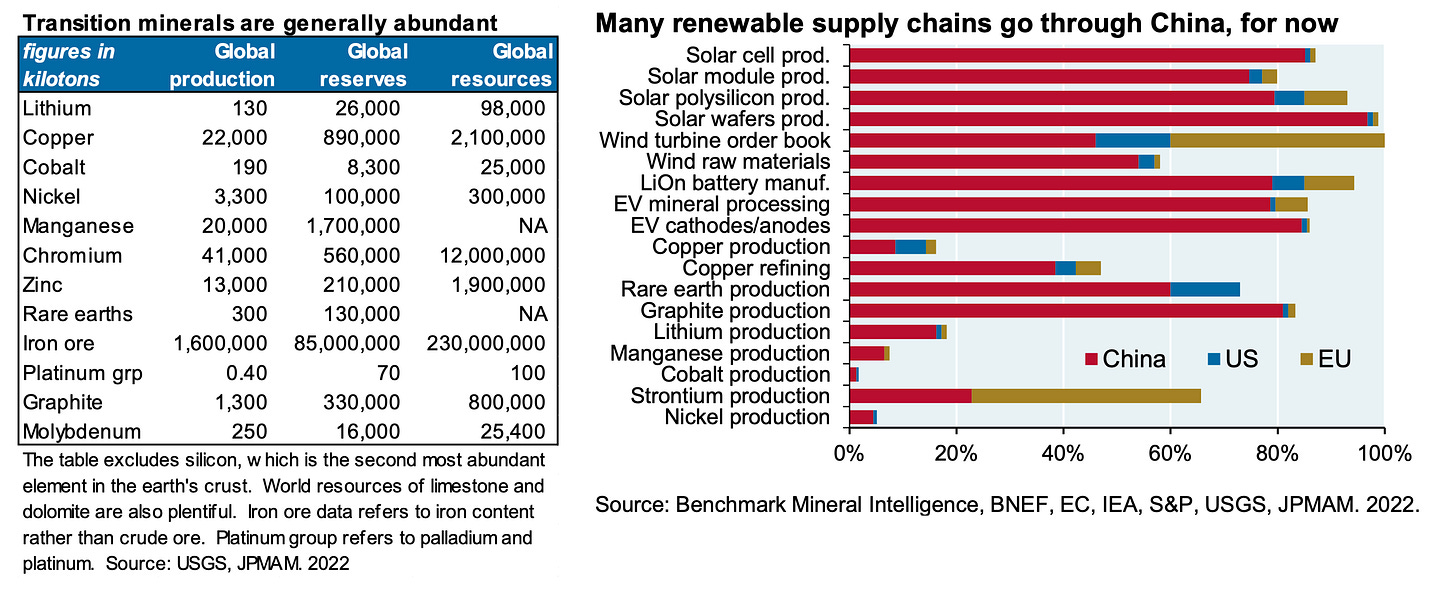Although these transition materials are abundant, the challenge lies in the reliability of supply, given the fact that many of these minerals are sourced from high geopolitical risk countries and the time required for these minerals to be mined and processed elsewhere. There is also a concentration risk as China is a dominant player in the renewable supply chain.