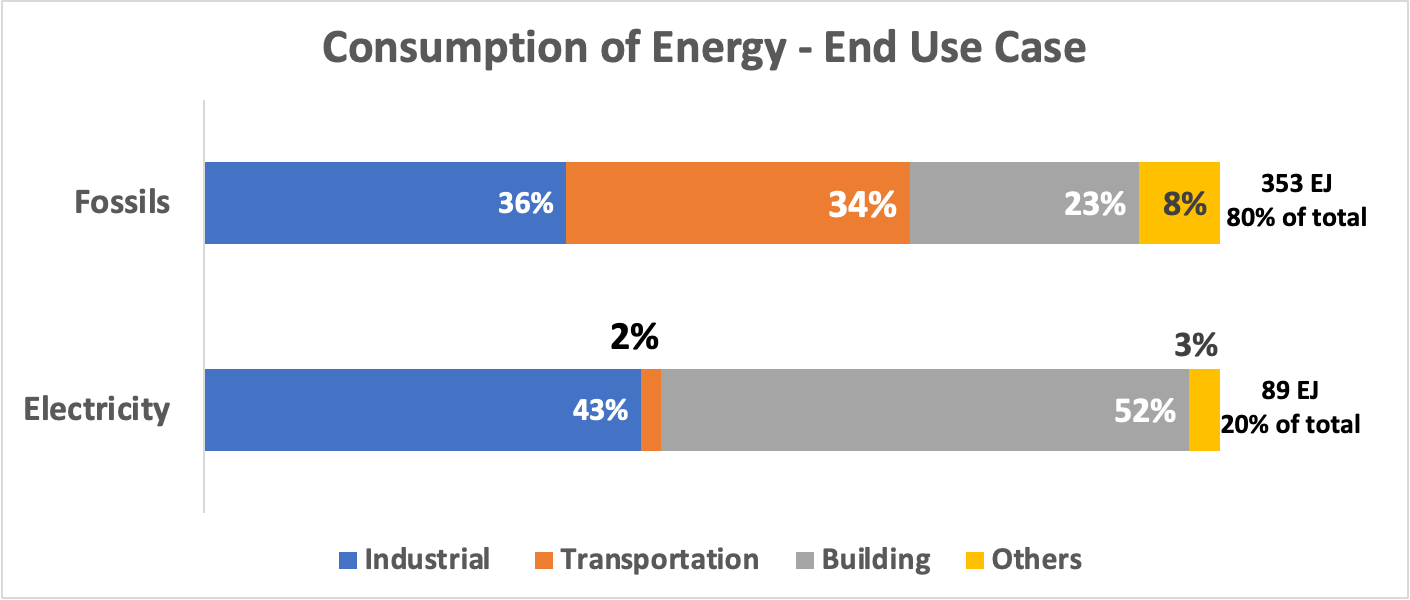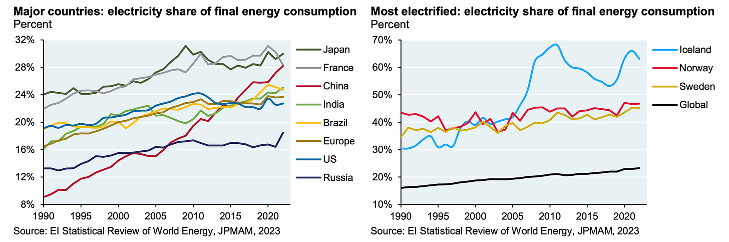 Only a handful of countries are electrified. The countries that account for the majority of the global energy consumption consume only 15%-30% of their energy via electricity.