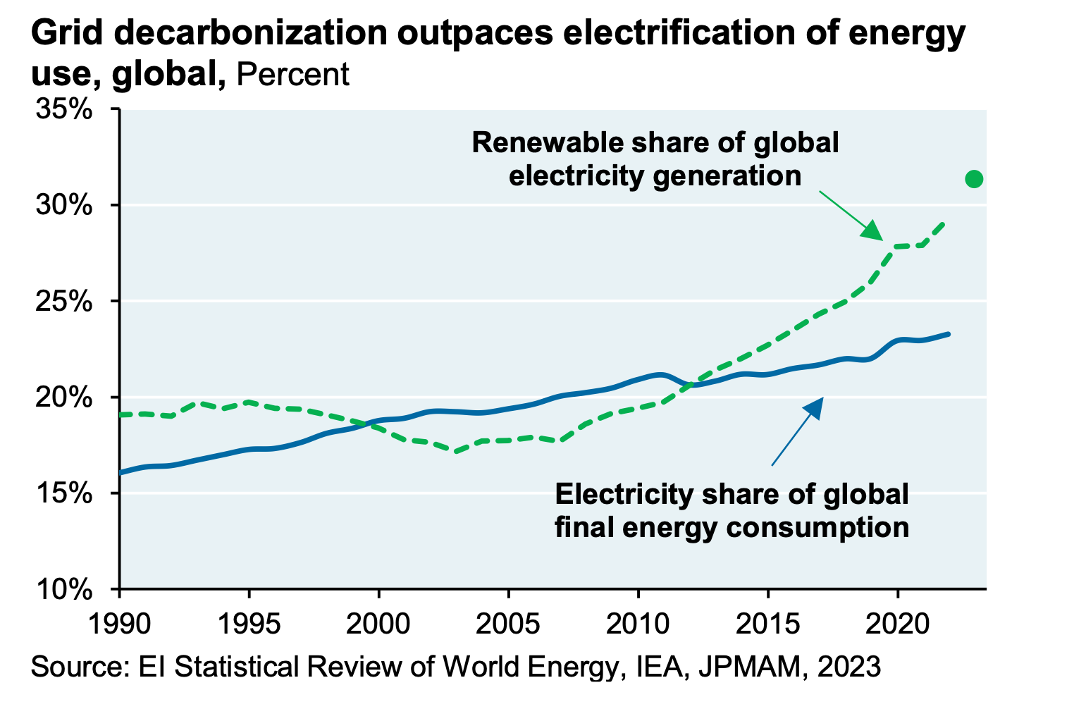 The decarbonizing of the grid is already underway. Over 30% of the global electricity is renewable. However, more renewable capacity needs to be added. More electrification will not make sense if our grid is not green.
