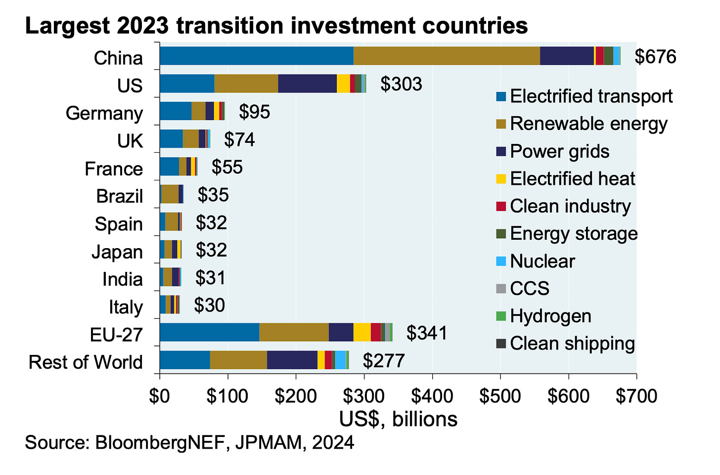 A lot of investments are already being poured towards this cause. (See below- with China spearheading the transition). The energy transition is very different from the transitions in technology, healthcare, and other sectors. It is a sum of multiple transitions happening at once and interacting with one another like Solar & Wind, EV, Battery, and Hydrogen which are accelerating independently and interacting with one another. This transition is also aided by the fact that it empowers countries to be self-reliant on their energy needs.