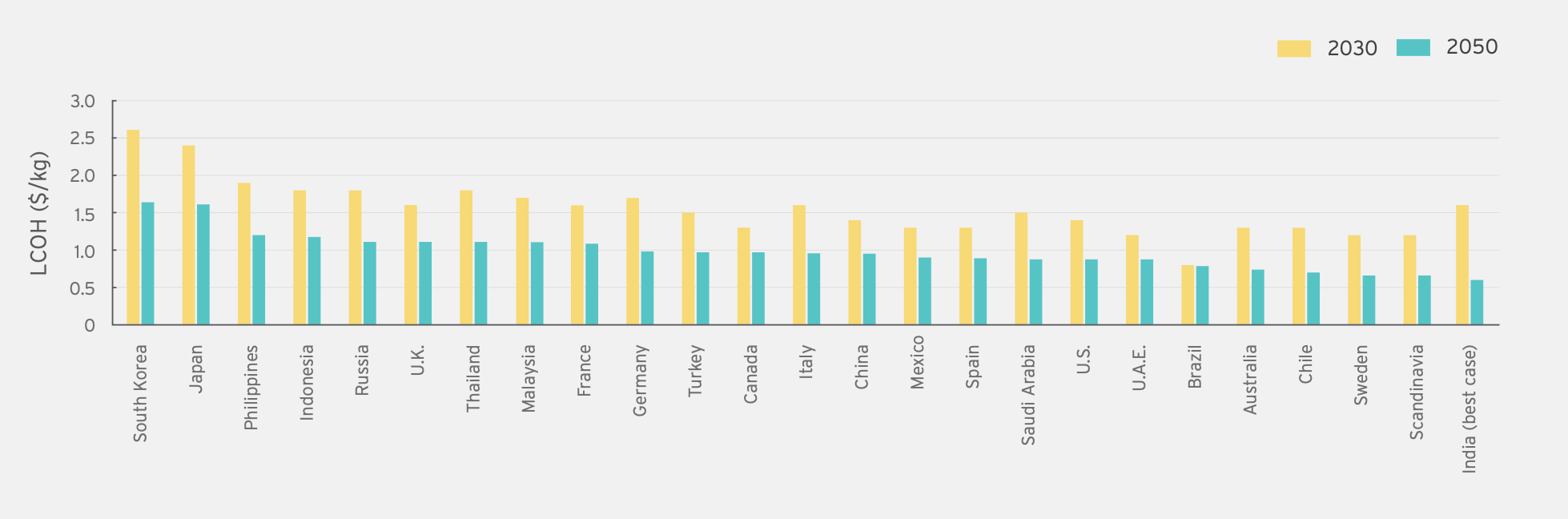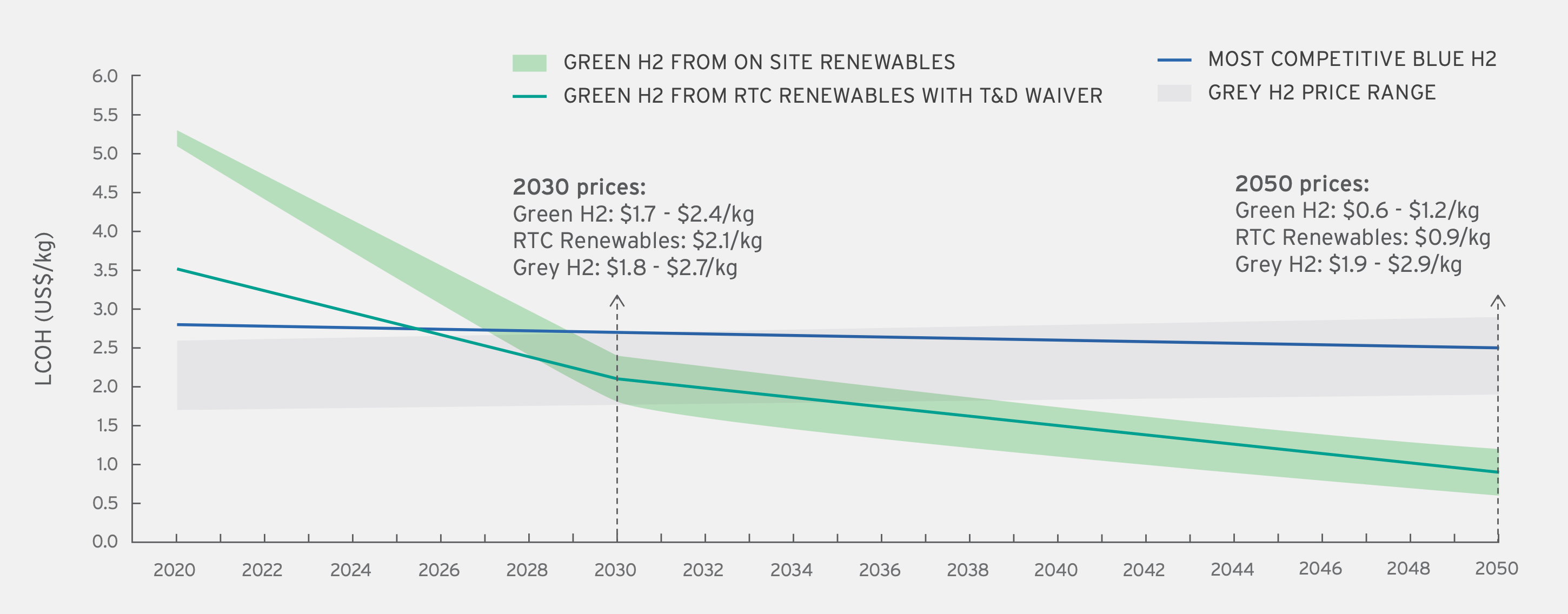 The cost of green hydrogen is dependent on the cost of electricity and the cost of electrolysers. The projected price trajectory of solar-green hydrogen production based on the decline in electrolyser and renewable costs is as follows: