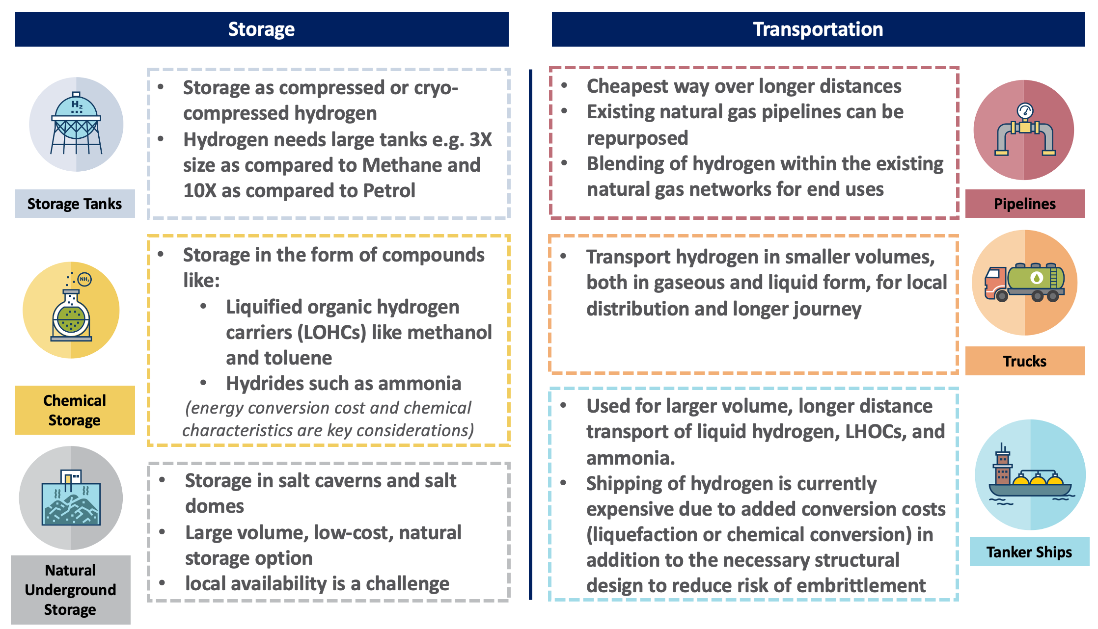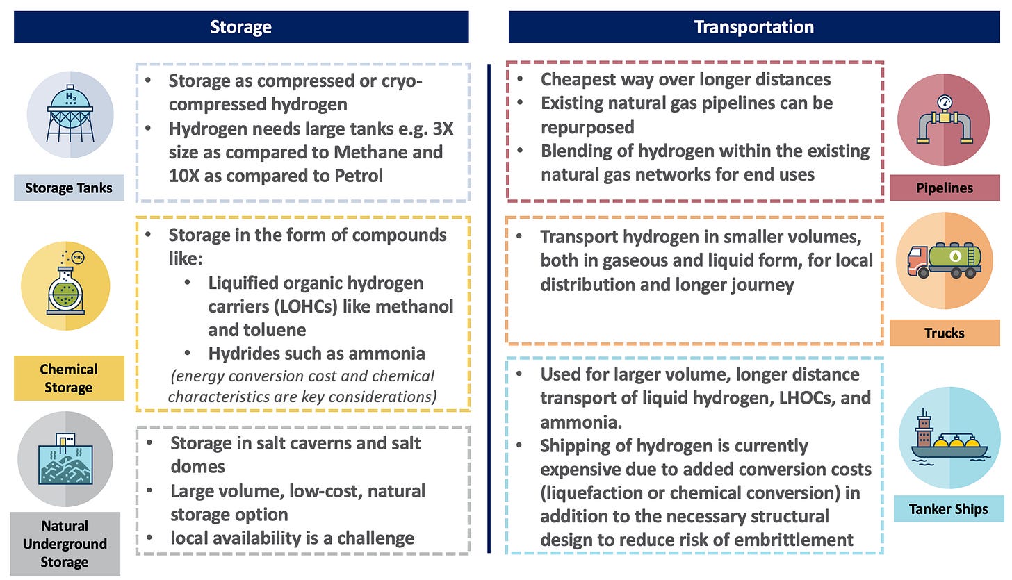 The properties of Hydrogen make it difficult to transport and store it. The various avenues of storage and transport are as follows: