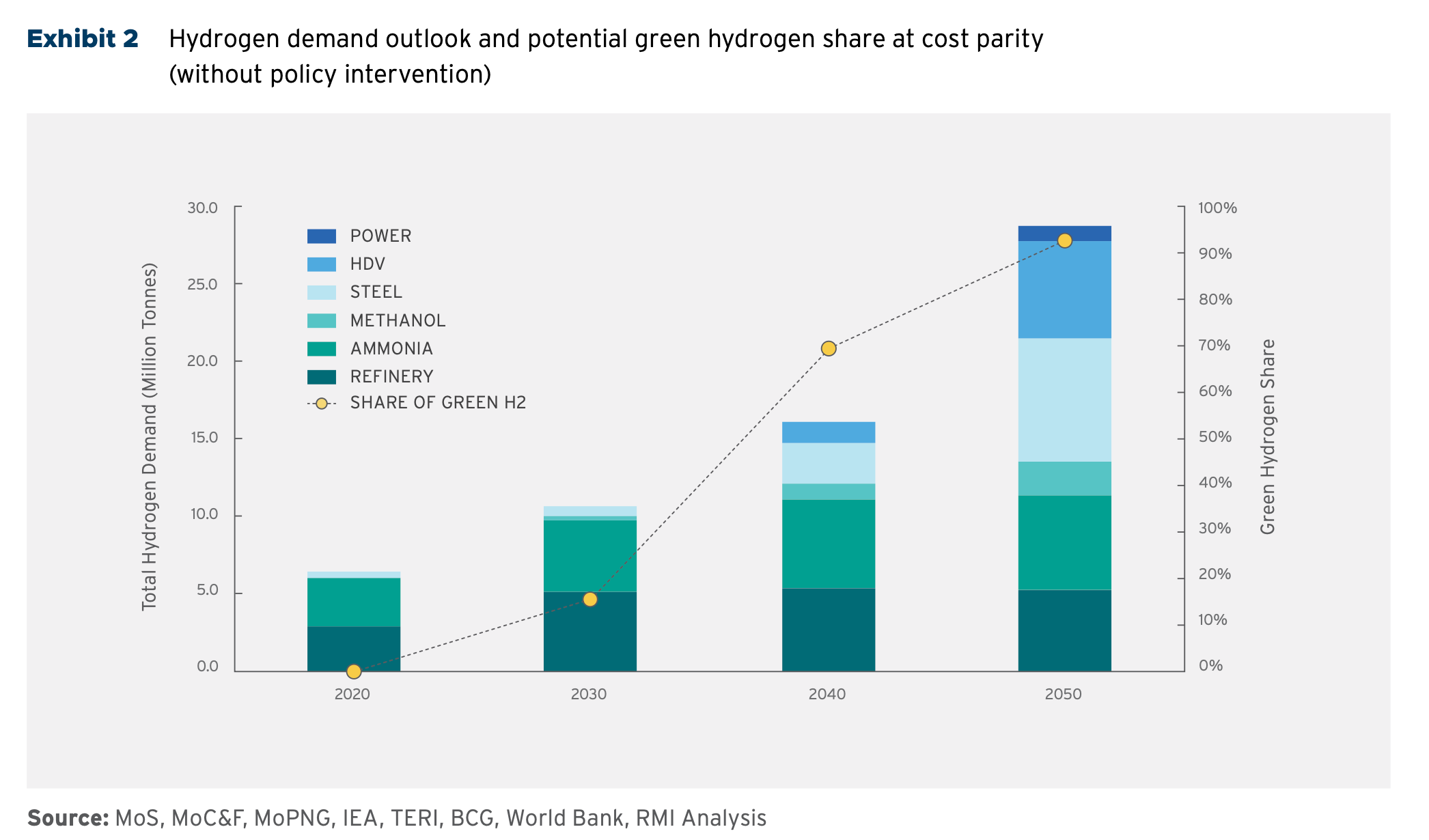 Estimated Demand for Hydrogen in India: 5X in 30 years. Over 90% of the demand is expected to be met from Green Hydgrogen