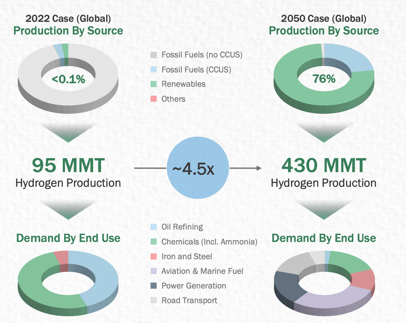 The production of hydrogen is expected to be 4.5 times the current production of which over 75% is green hydrogen while the rest is Blue hydrogen. The use cases of hydrogen will become mainstream in sectors like mobility (Road, aviation, and marine) and power generation.