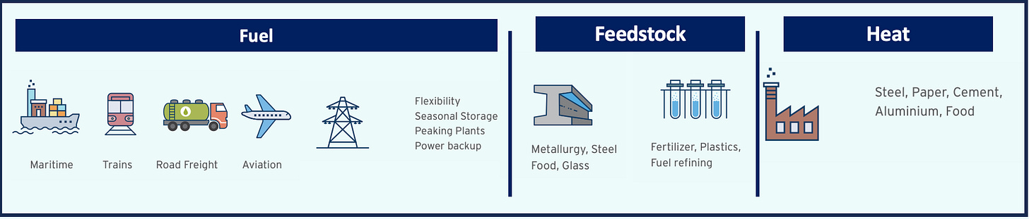 Fuel: through either direct combustion or electricity generation through fuel cells in mobility sectors like heavy-duty trucking, aviation, and maritime shipping.