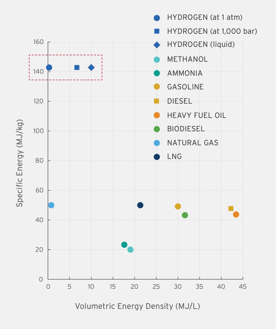 Hydrogen’s energy content per unit of mass (specific energy) is higher than most hydrocarbon fuels. In contrast, its volumetric energy density is the lowest. So you either need a huge volume or alternatives being pressurization or liquefaction before hydrogen can be used as a fuel.
