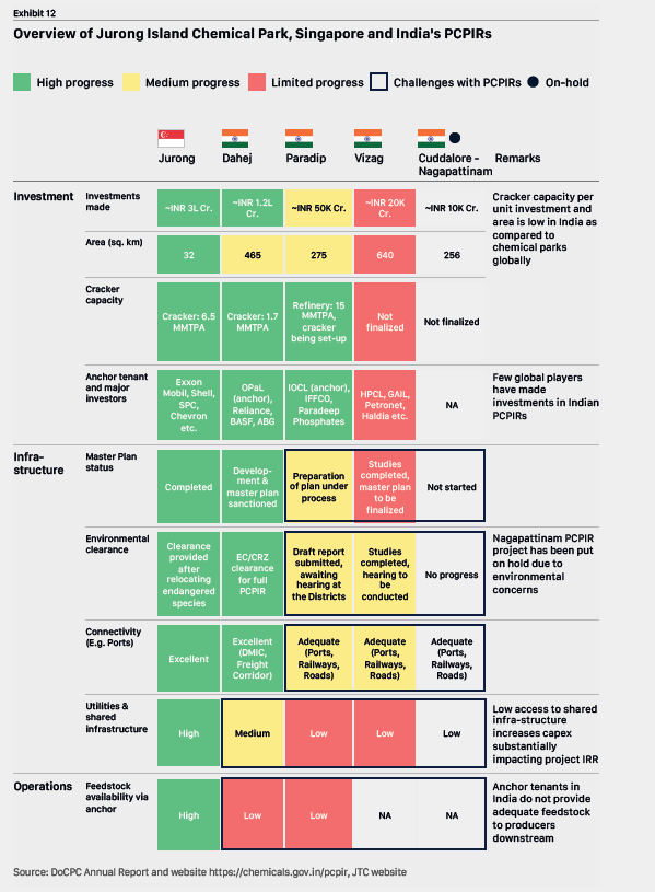 Plus proactive support from the government and furthering sustainability initiatives reducing carbon footrprint (Chemicals is a carbon heavy industry)The fact is India already has four approved chemical hubs - in Visakhapatnam (Andhra Pradesh), Dahej (Gujarat), Paradip (Odisha), and Cuddalore and Nagapattinam 16(Tamil Nadu) (approved but on hold) - that have made some progress in attracting investments and creating jobs, there are still critical areas that need further attention to fully realize their potential.