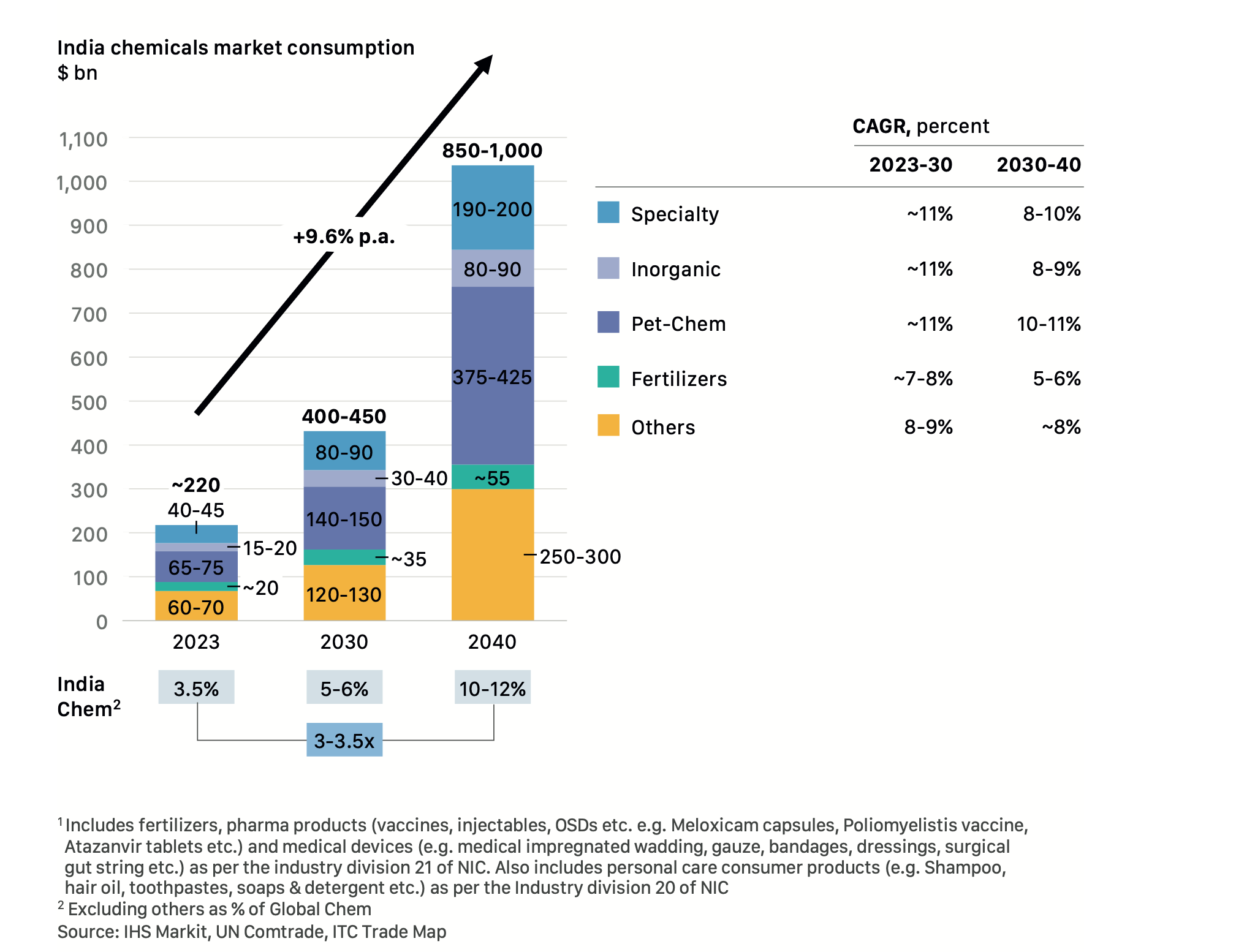 India’s chemical consumption was valued at approximately $220 billion in 2023 and is projected to grow to $400–450 billion by 2030.