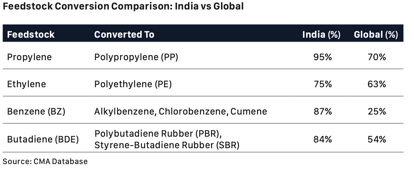 Chemical Industry is dominated by commodity chemicals or upstream chemicals. This is evident from the feedstock conversion % vis-a-vis Global averages