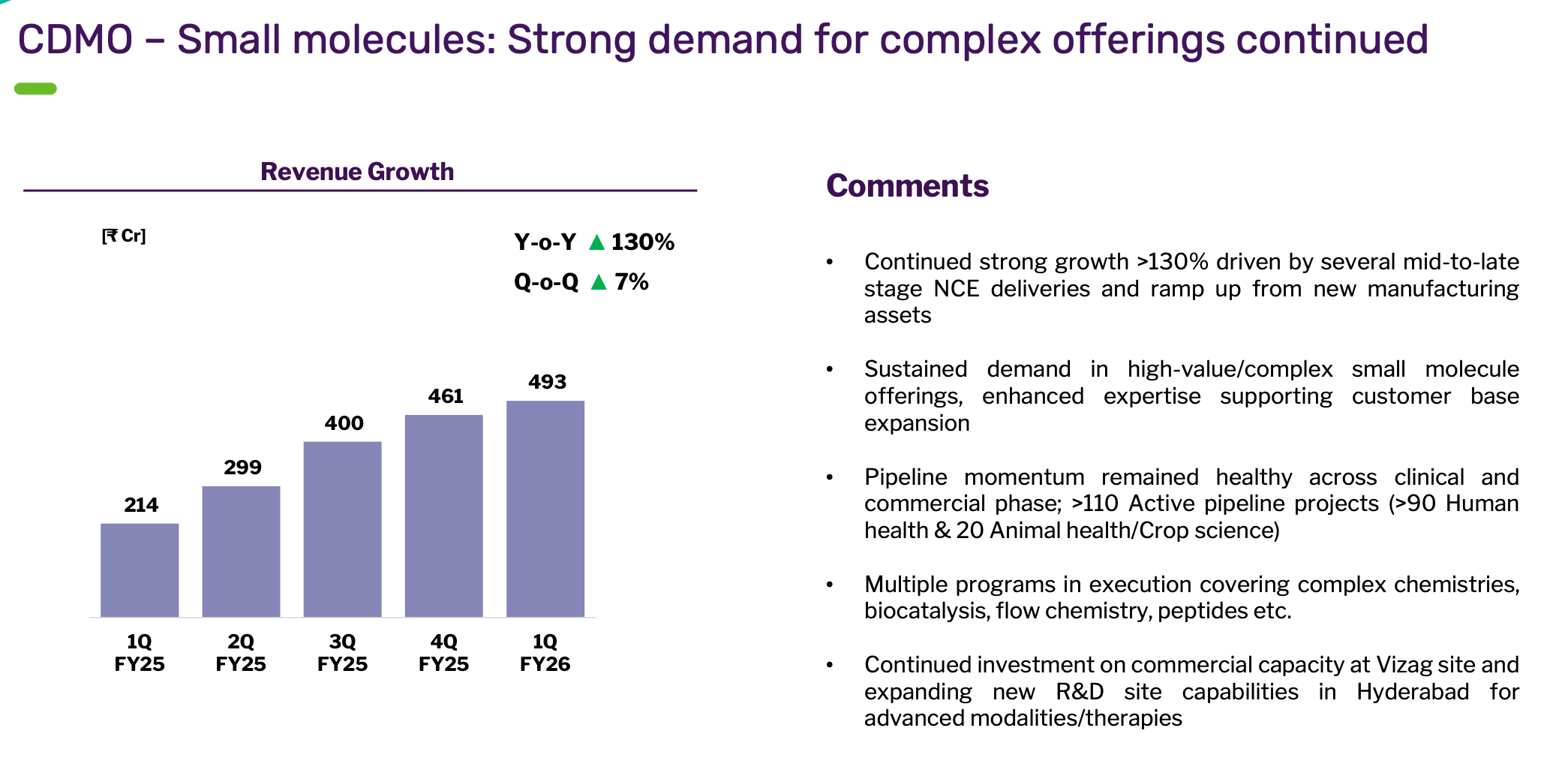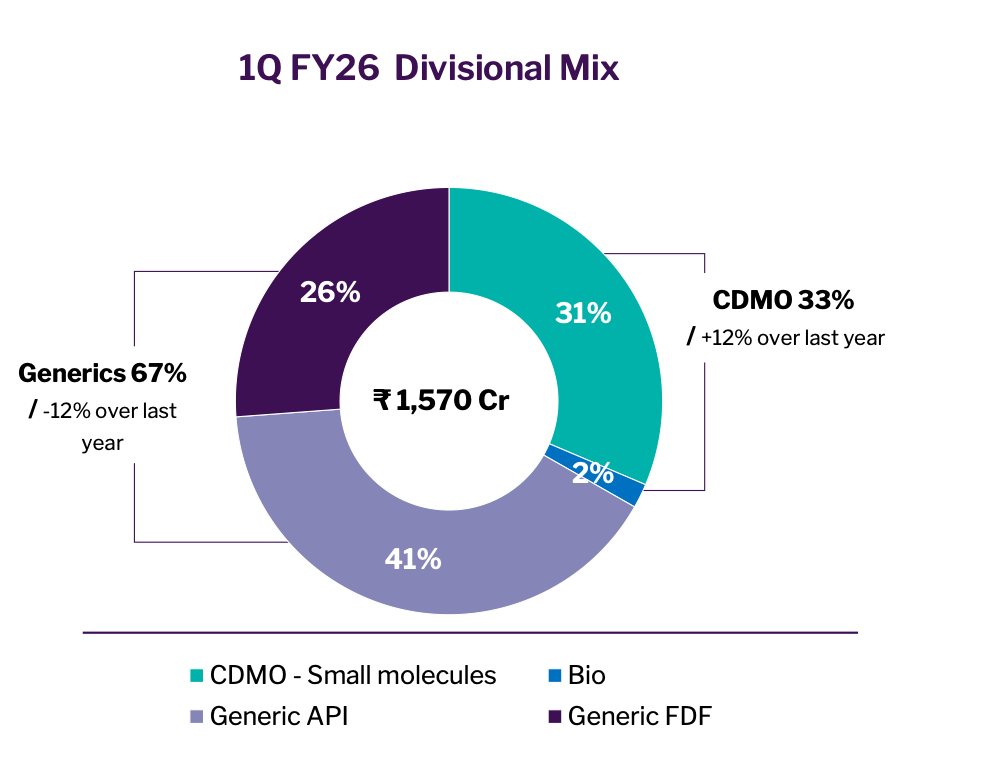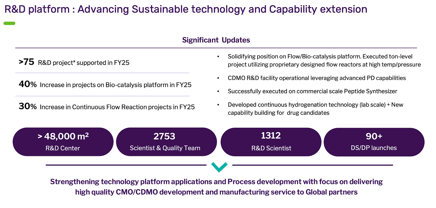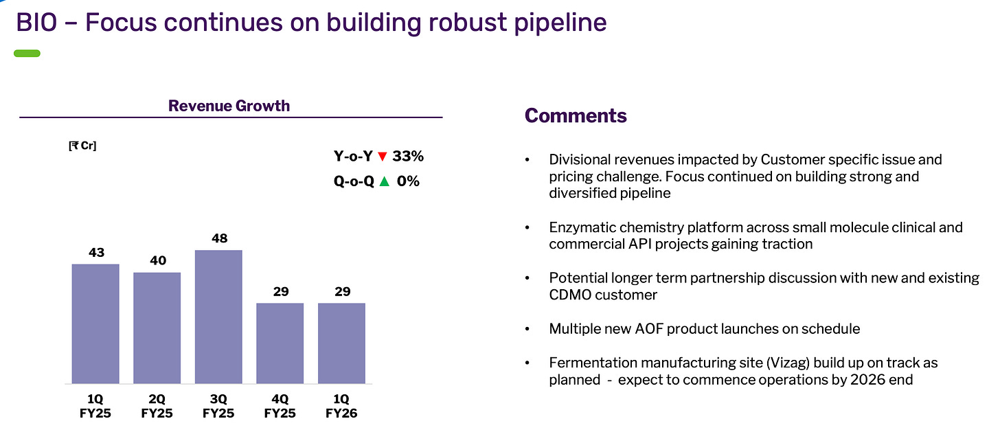 This is an indication of where the business is pivoting. CDMO as a % of total revenue is increasing while the contribution of Generic Business is decreasing. They manufacture both API and formulations for ARV, which is a saturated market. This also points out that CDMO is growing at a much faster pace.Apart from the impressive growth (remember CDMO is a lumpy business), the key highlight is the pipeline and investments in capabilities like flow chemistry, biocatalysts etc. Bio Division was muted this quarter due to specific issues but look to grow here as well