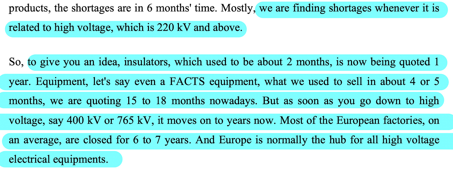 This is accentuated more in the high-voltage projects, where delivery timelines have expanded to a great extent. We can gauge the supply coming in when the timelines start shortening.