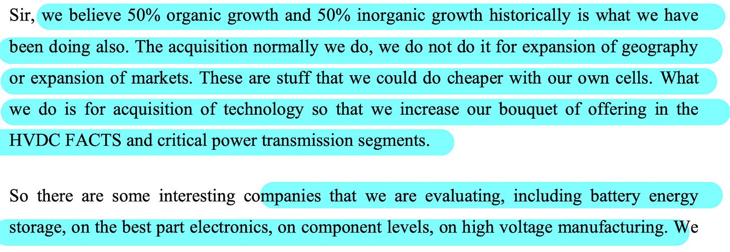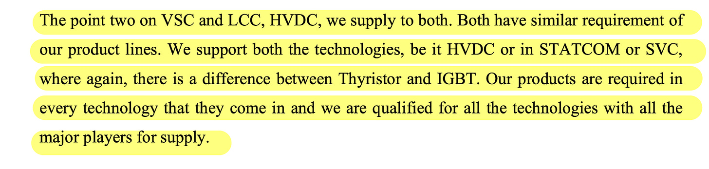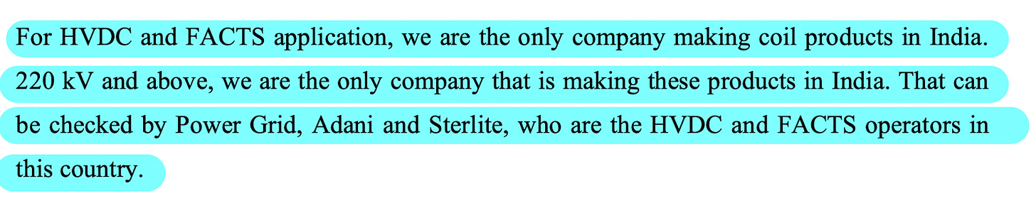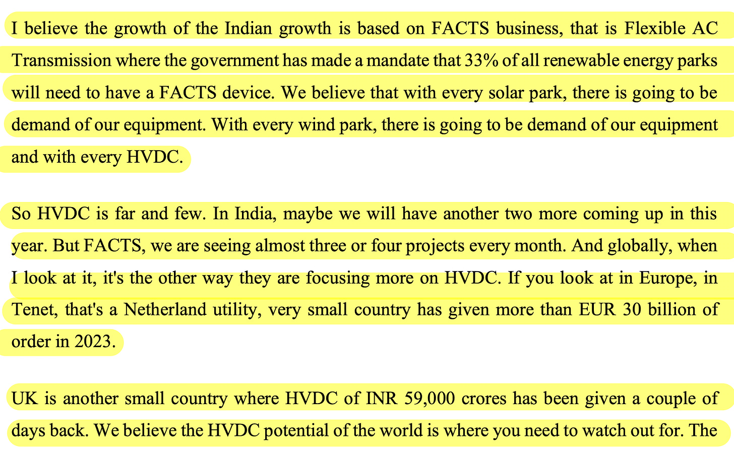 The industry in India is expected to grow at 15%+ and HVDC and FACTS at 60% plus. This is an Industry where a lot of technical know-how is required, and there are not many players.