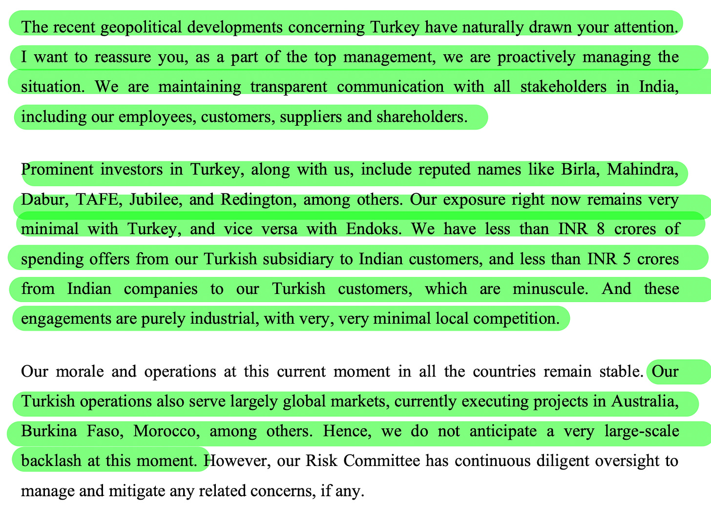 Turkey operations are where the most value-added products are being manufactured. The geopolitical risks with Turkiye supplying drones to Pakistan in the India-Pakistan Conflict backlash against Turkiye’s businesses in India, there can be repercussions against Indian operations in Turkiye - capital controls, etc., can’t be ruled out.