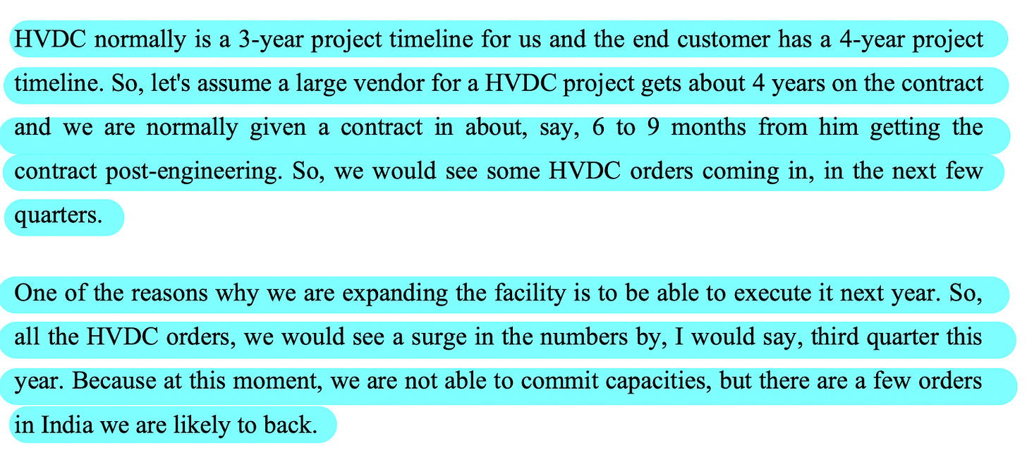 HVDC order is 50-150 Cr (2-3 Year execution period billed every month) while FACTs order is 20-50 cr (12-15 months)