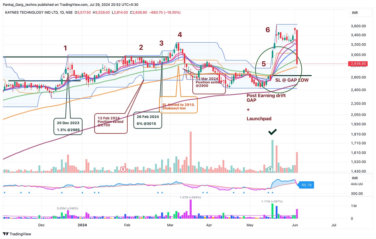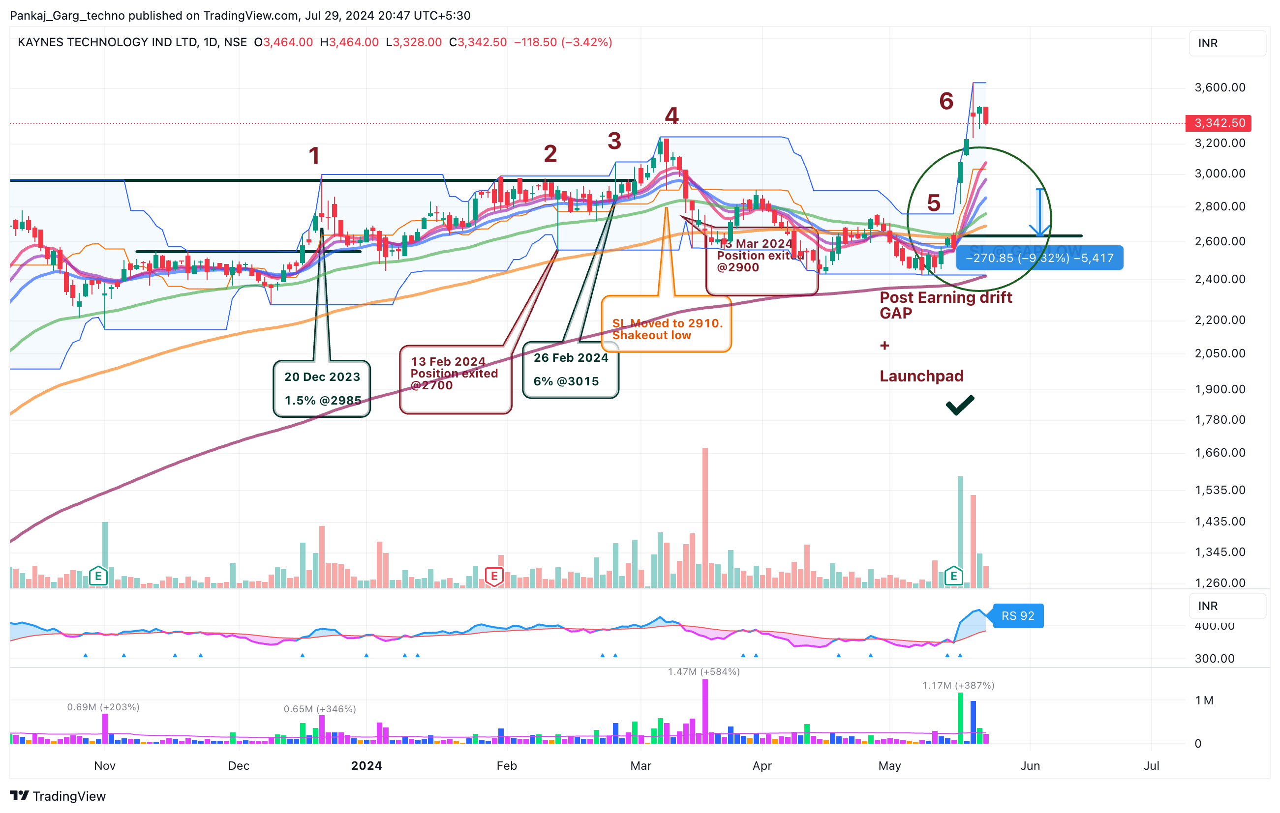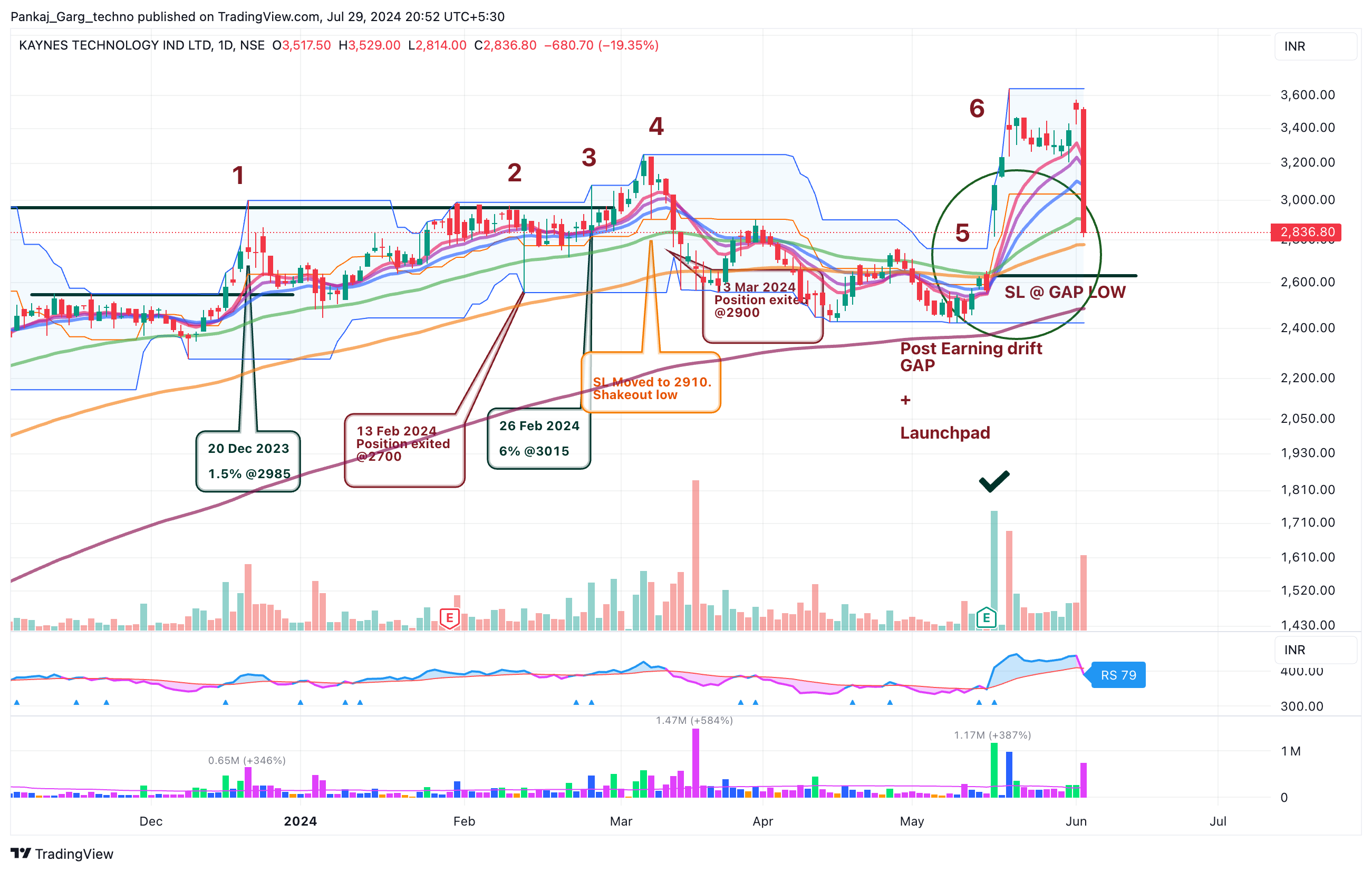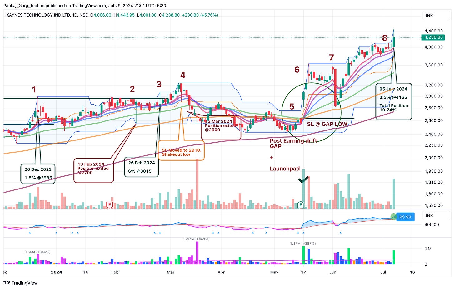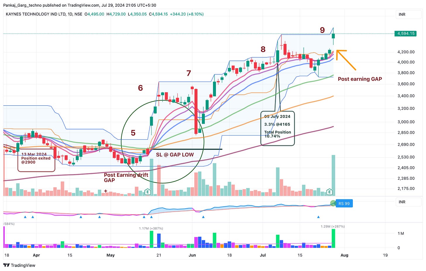 Kaynes gapped up after blockbuster results. Converging MAs + Gap + High Volume.
