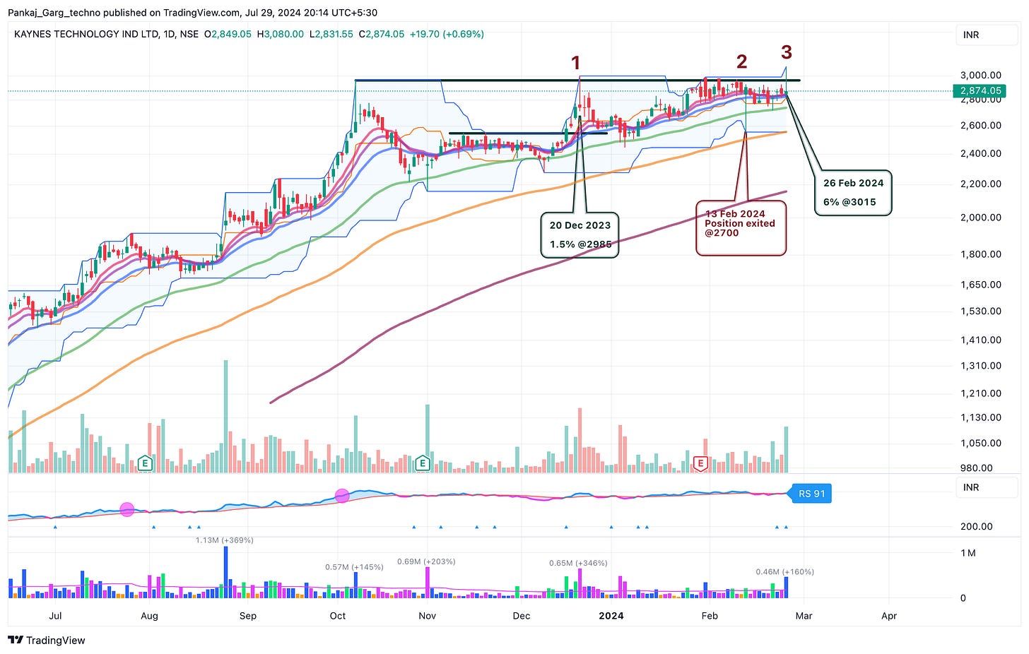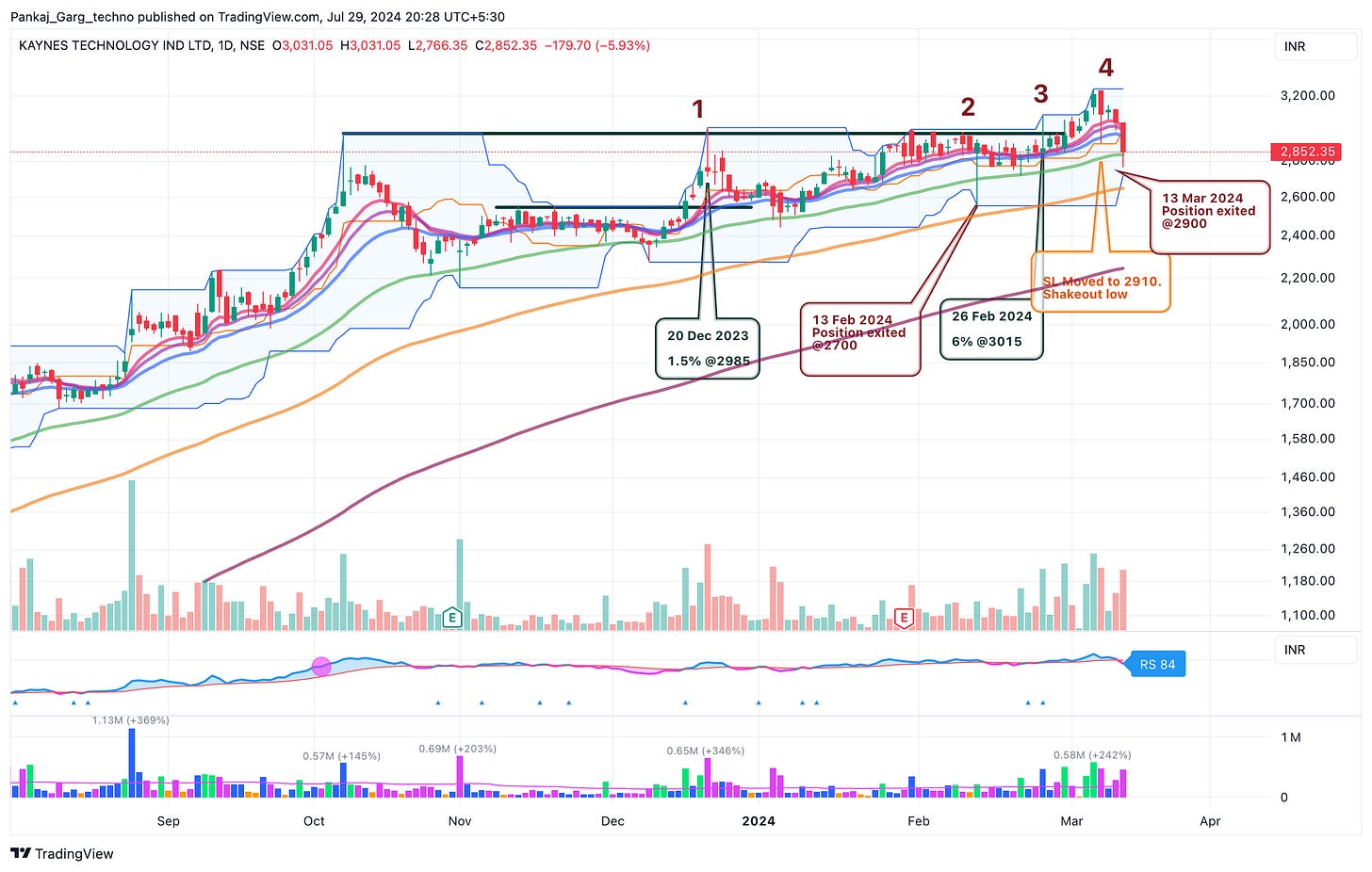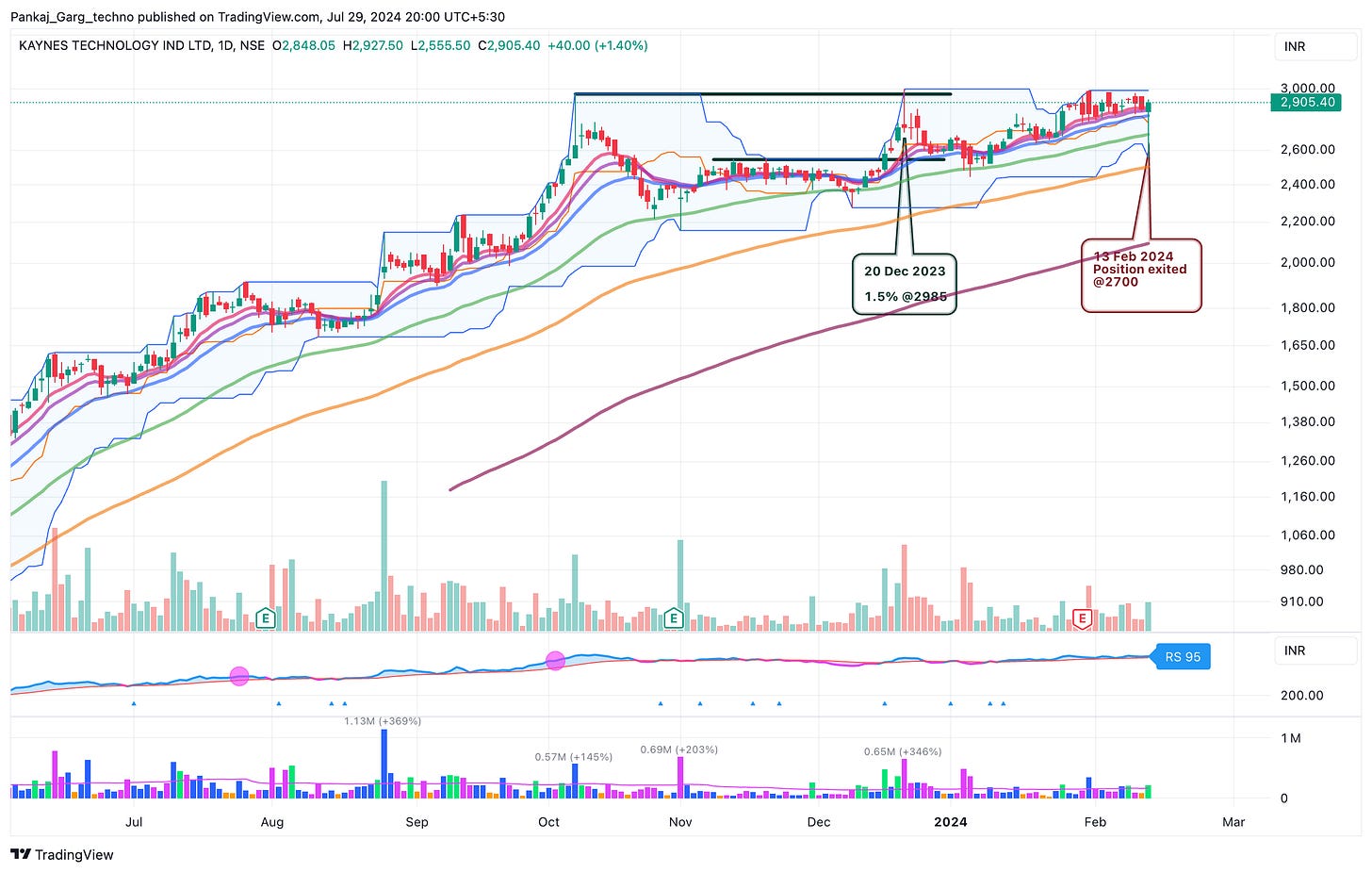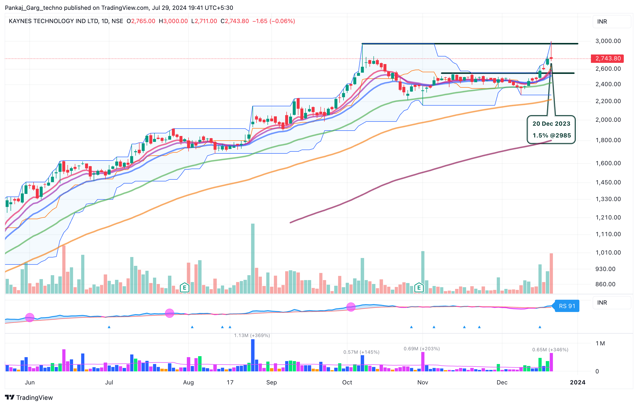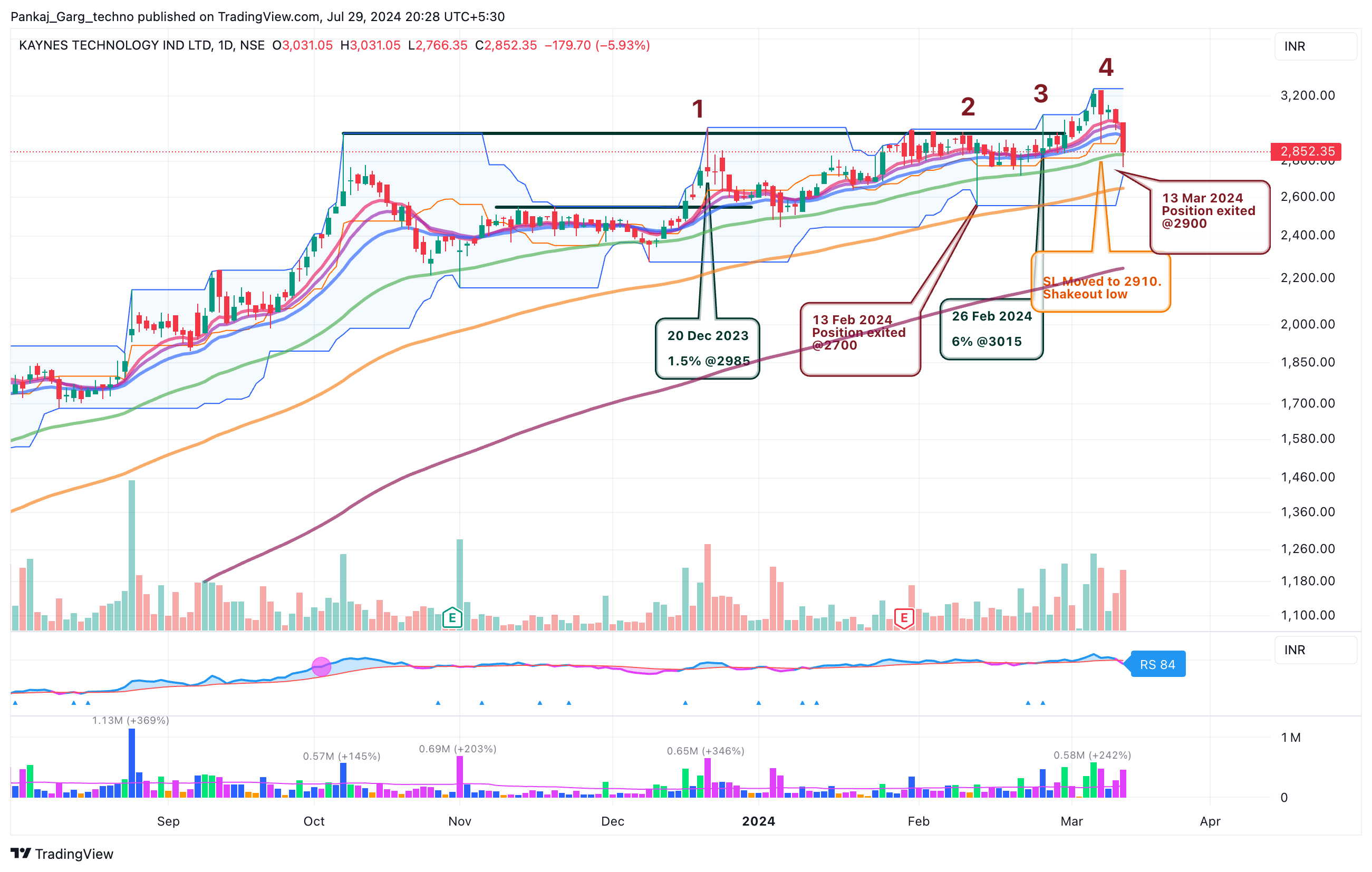 Kaynes gapped up after blockbuster results. Converging MAs + Gap + High Volume.