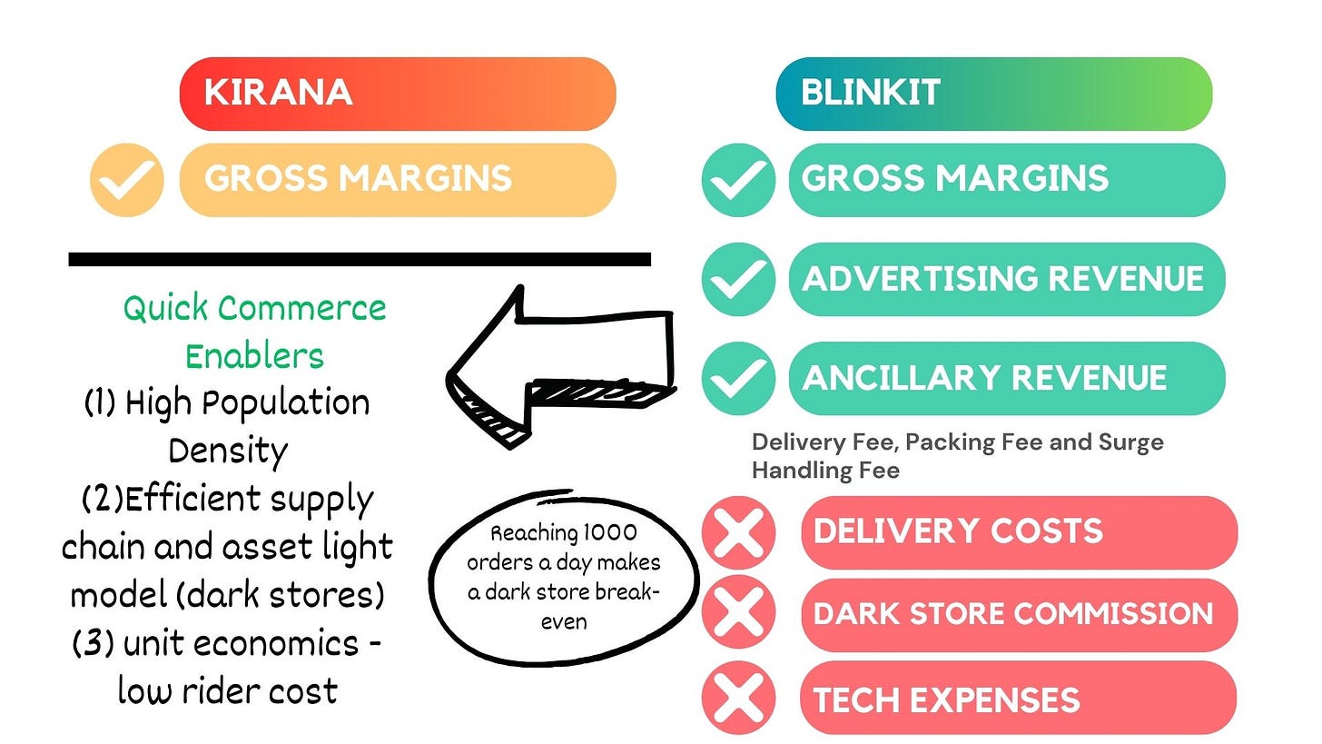 Whereas a Kirana store earns mainly from the margin it makes (take rate), Quick commerce companies have other revenue streams as well i.e. Advertising and Ancillary.