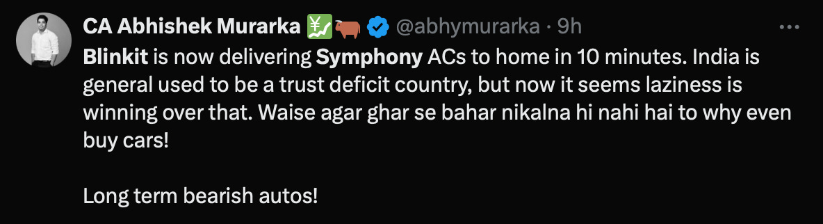 IMHO Blinkit is a value migration play from Unorganized Retail to Organized Retail among which Quick commerce will grab a lion's share.