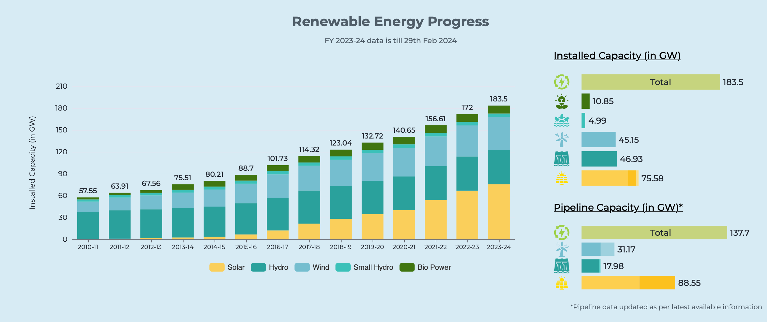 India has added 75.5 GW of solar since 2010 making Solar Energy the largest in the renewable energy mix (60% of renewable energy). More than the current installed capacity is already in the pipeline.