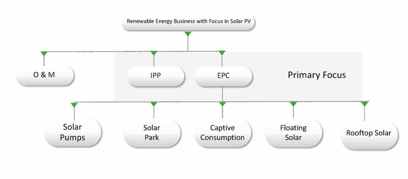 The group is present in renewable space. It has end-to-end capabilities in Solar Energy. The main company of the group is Waaree Energies Ltd. (WEL), which with its subsidiaries executes in different areas in the Solar Ecosystem.