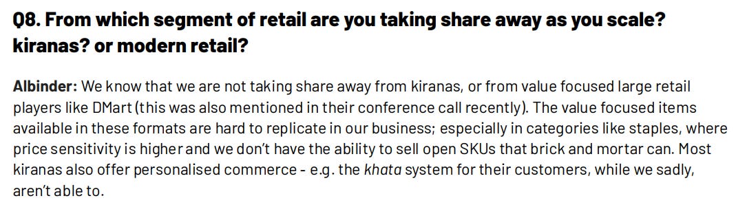 I believe there is some new demand creation by Quick Commerce Companies plus they are definitely taking away share from kiranas and e-Commerce.